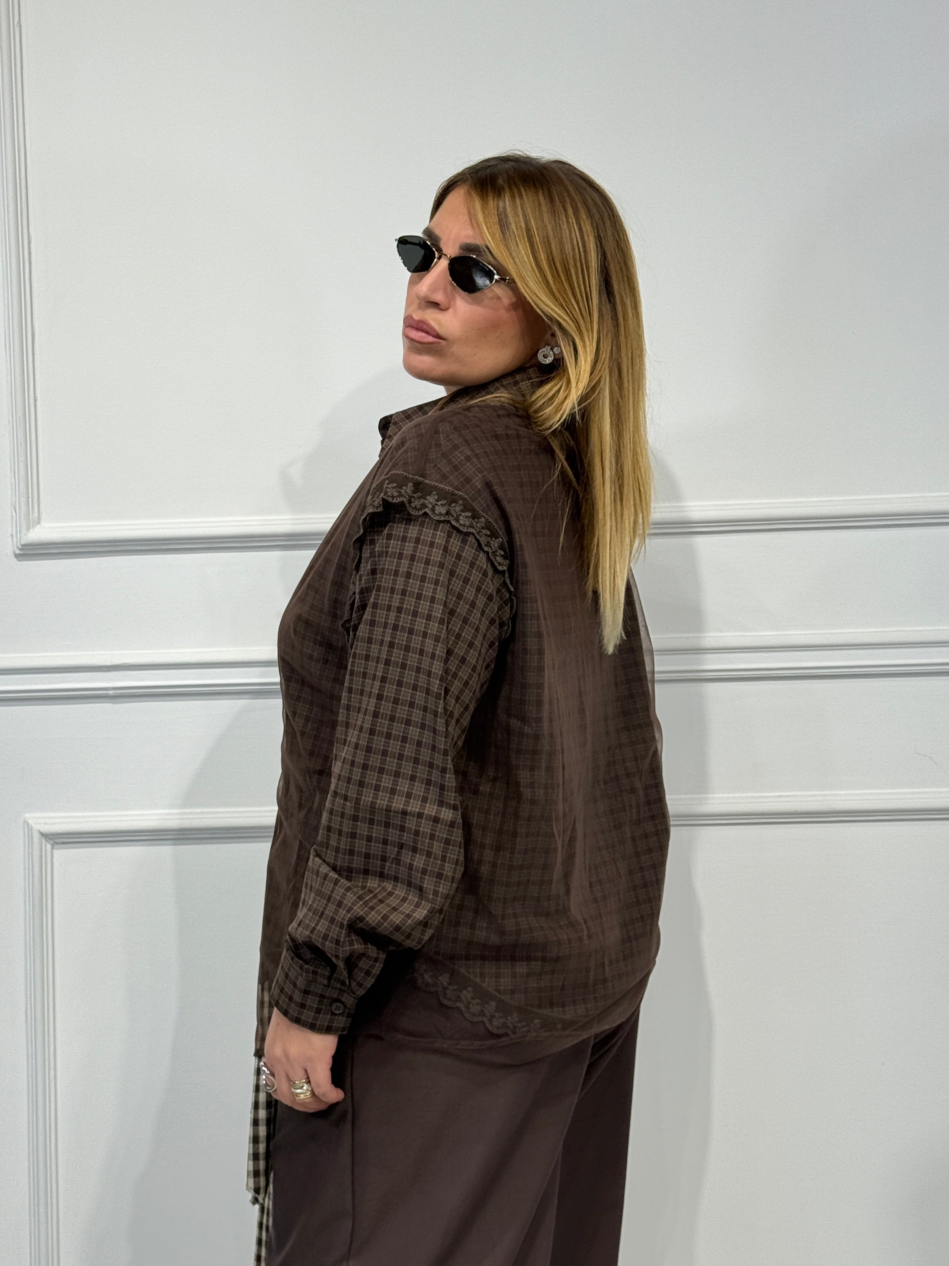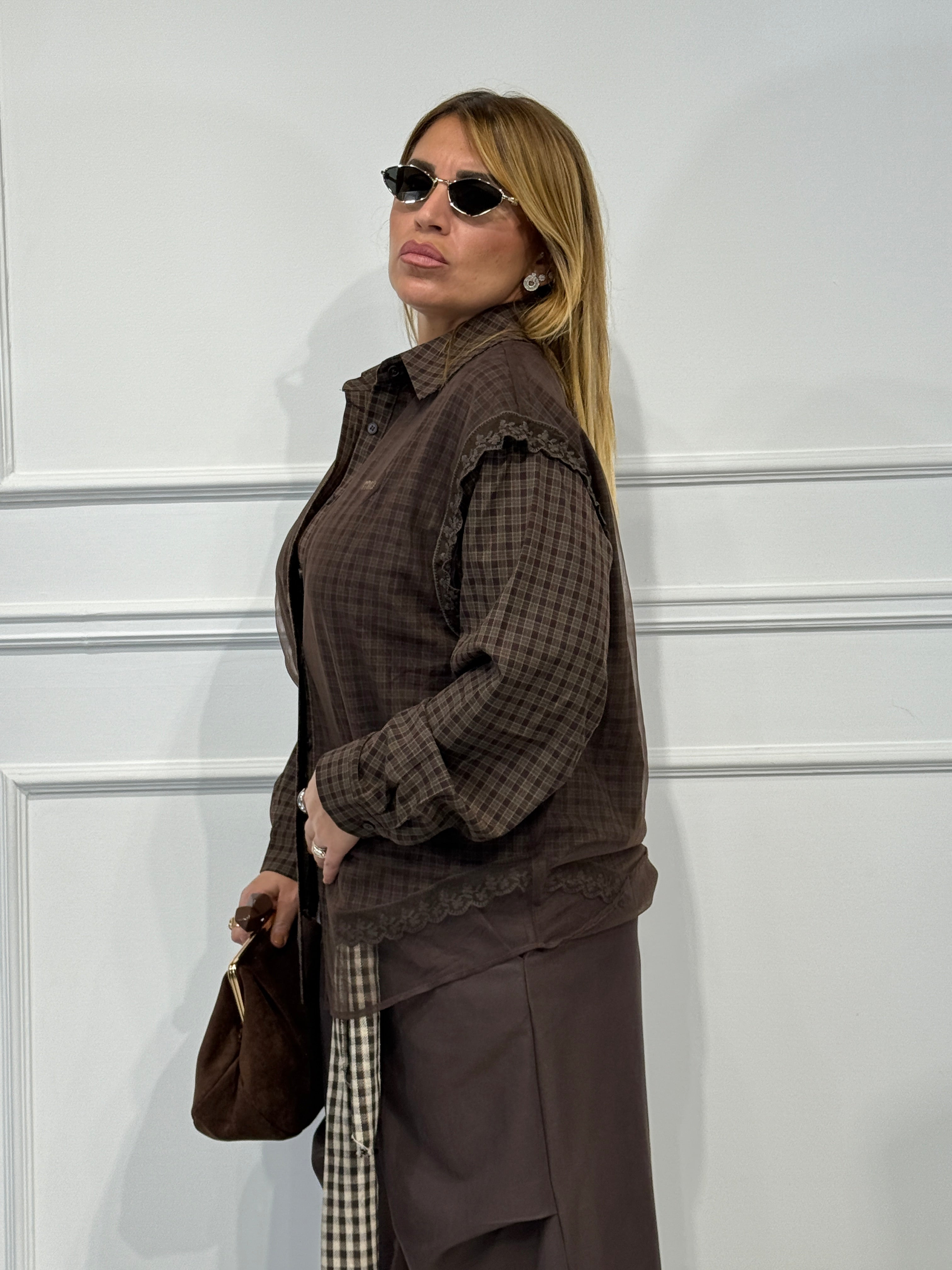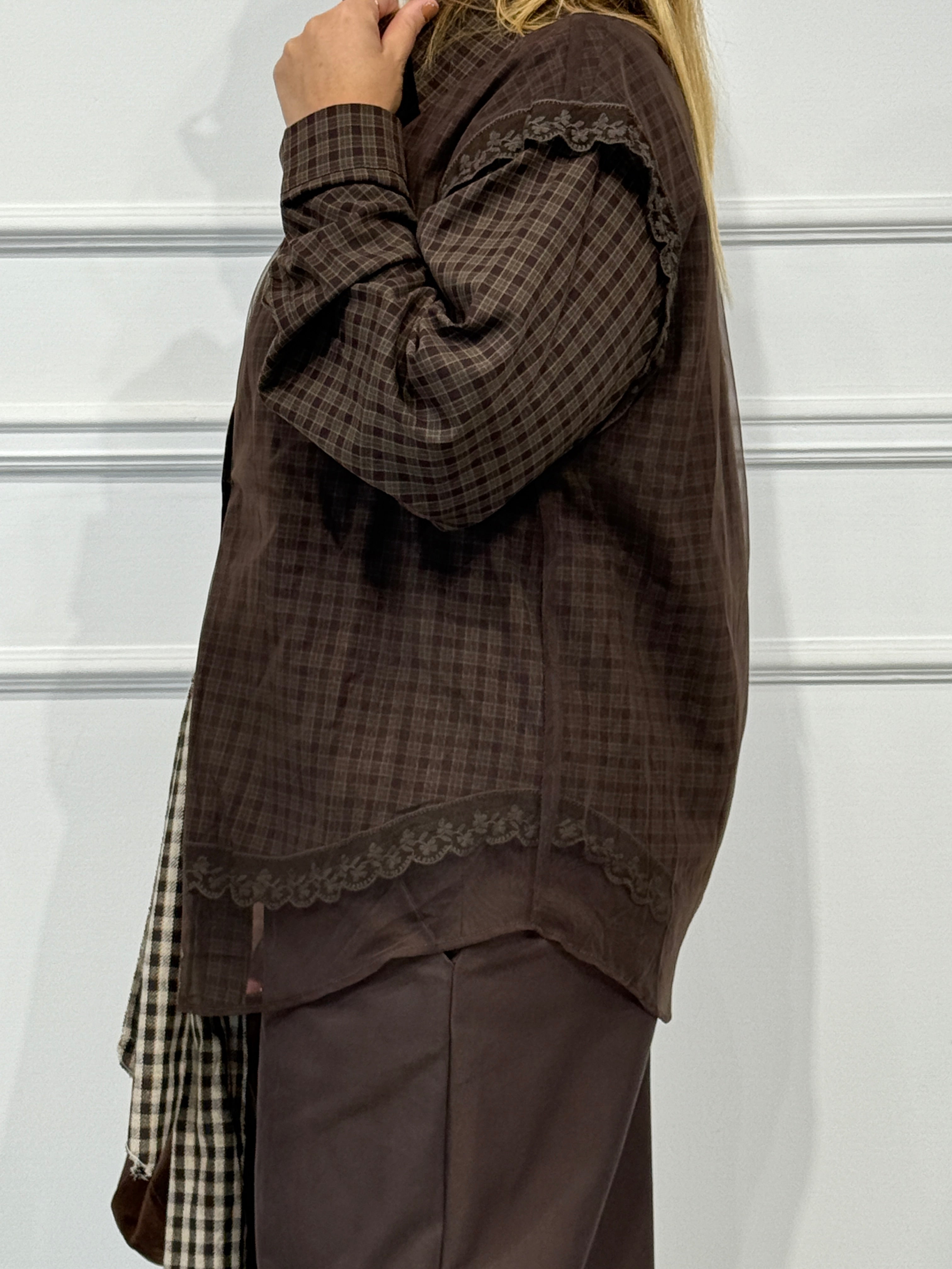 Camicia quadri over size tessuto con gilet velo sopra e dettagli merletto veste fino a 48
