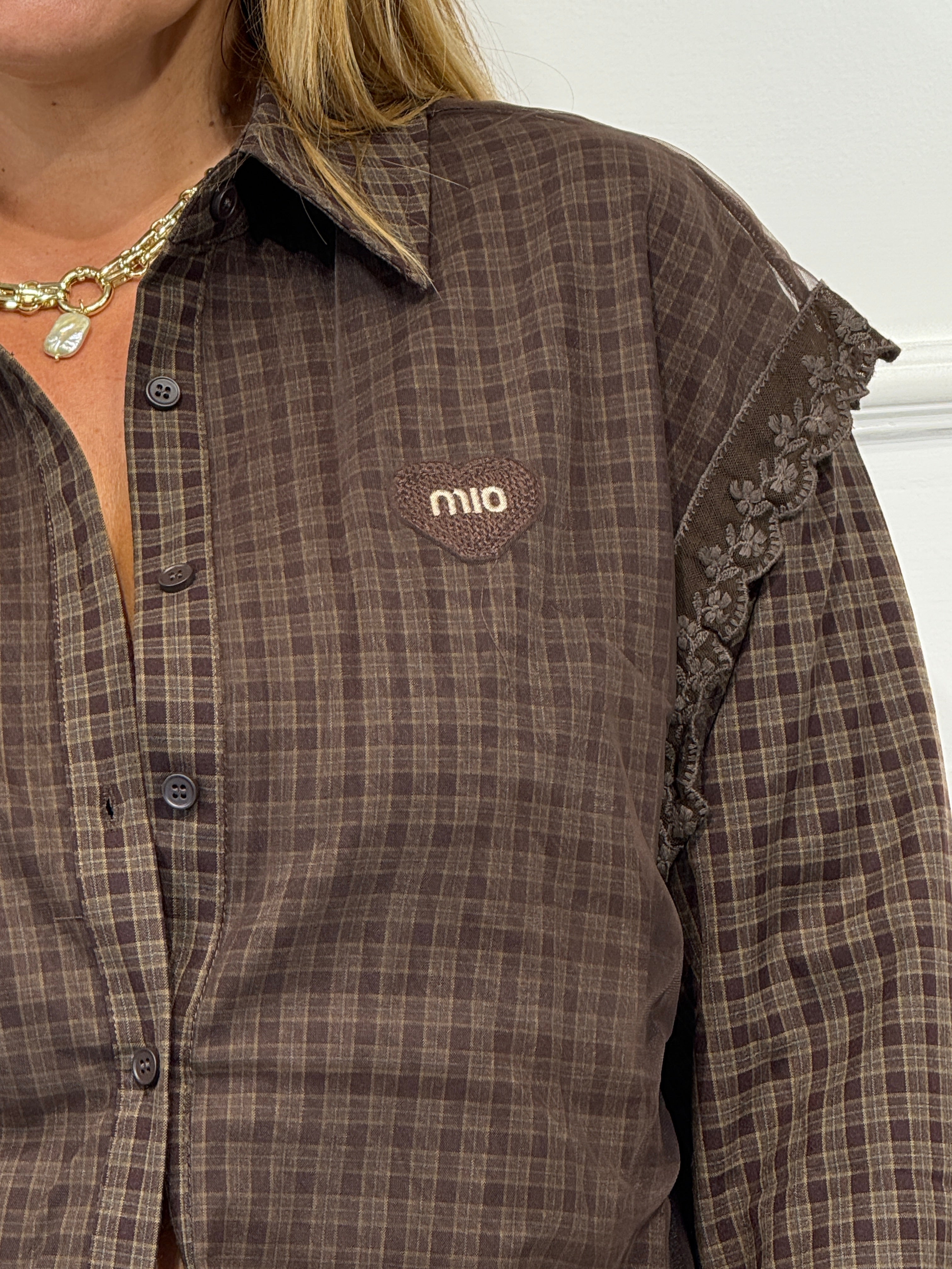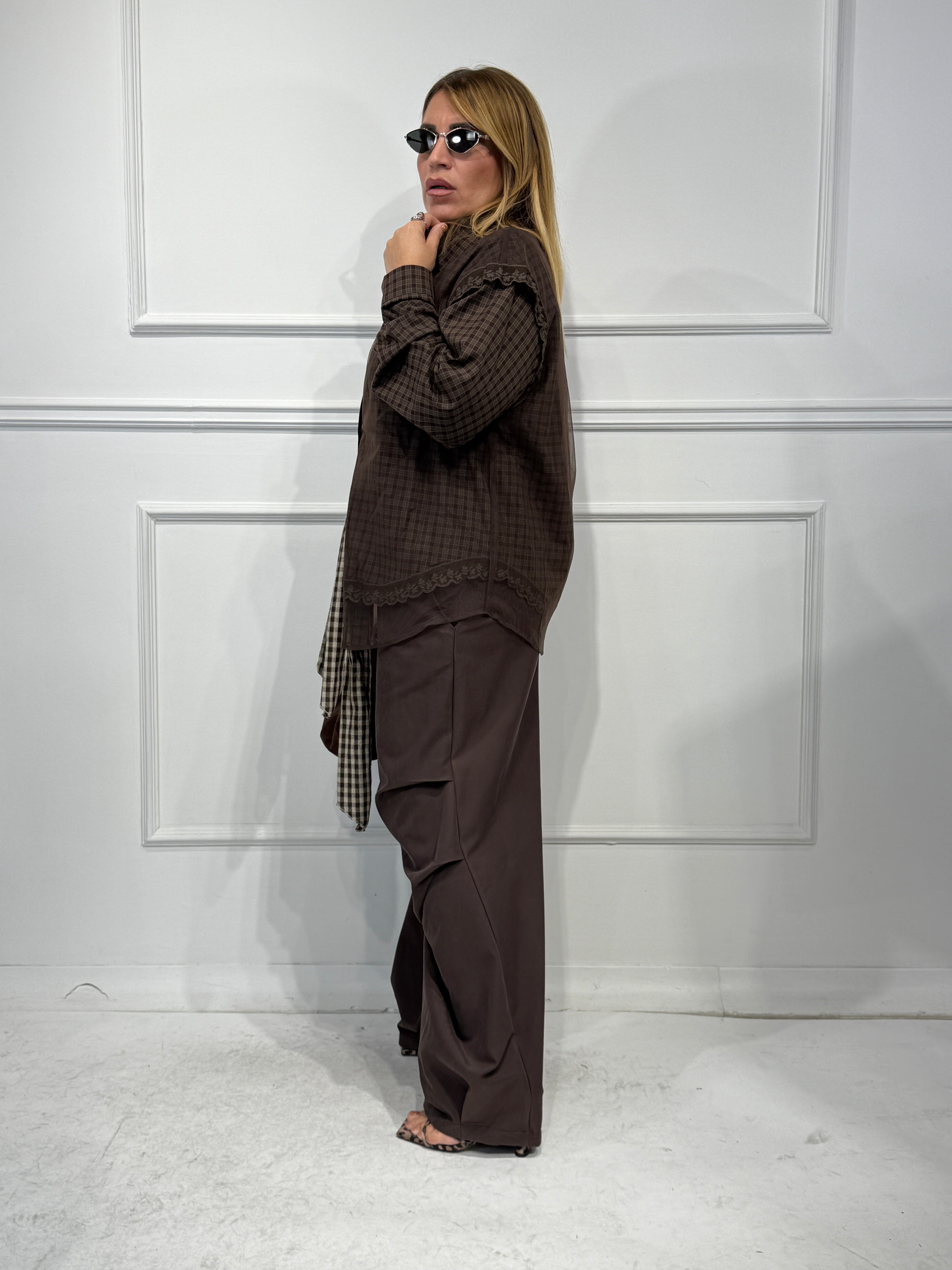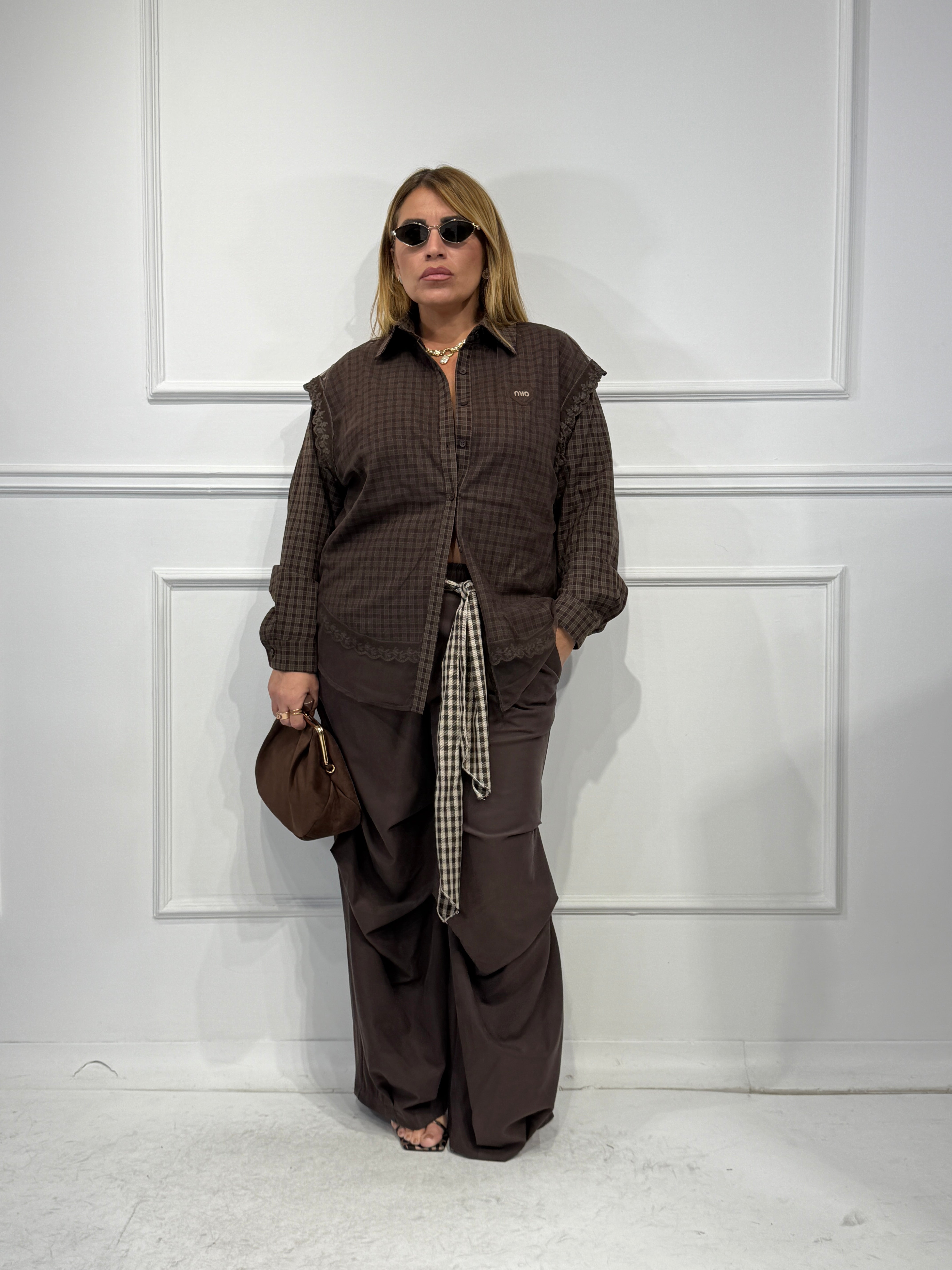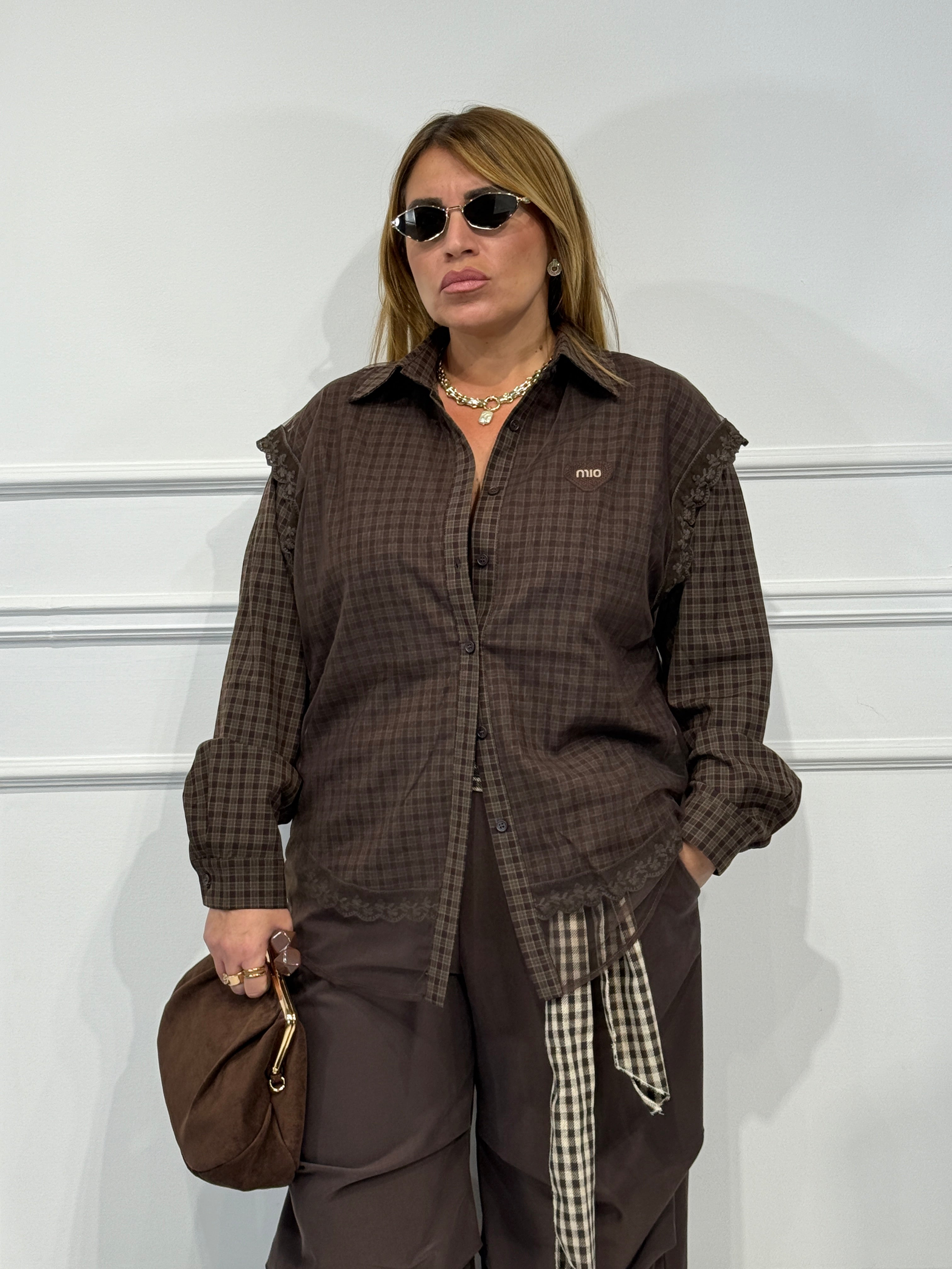 Camicia quadri over size tessuto con gilet velo sopra e dettagli merletto veste fino a 48