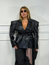 Giacca in ecopelle con spallina molto pronunciata,con cintura in vita