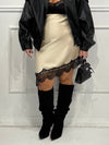 Mini Gonna in raso con pizzo la fondo taglio trasversale.Taglia unica veste fino a 46 .