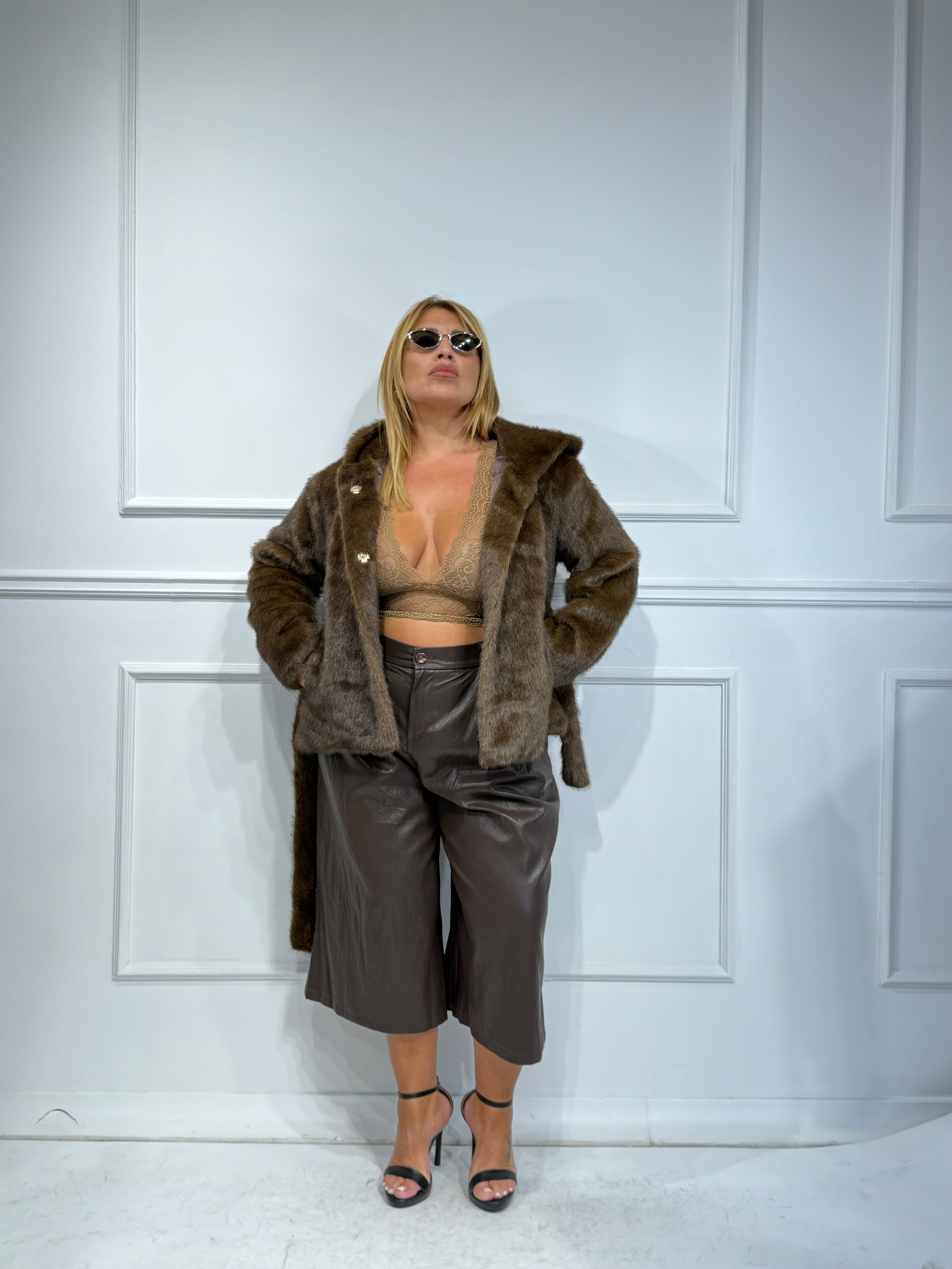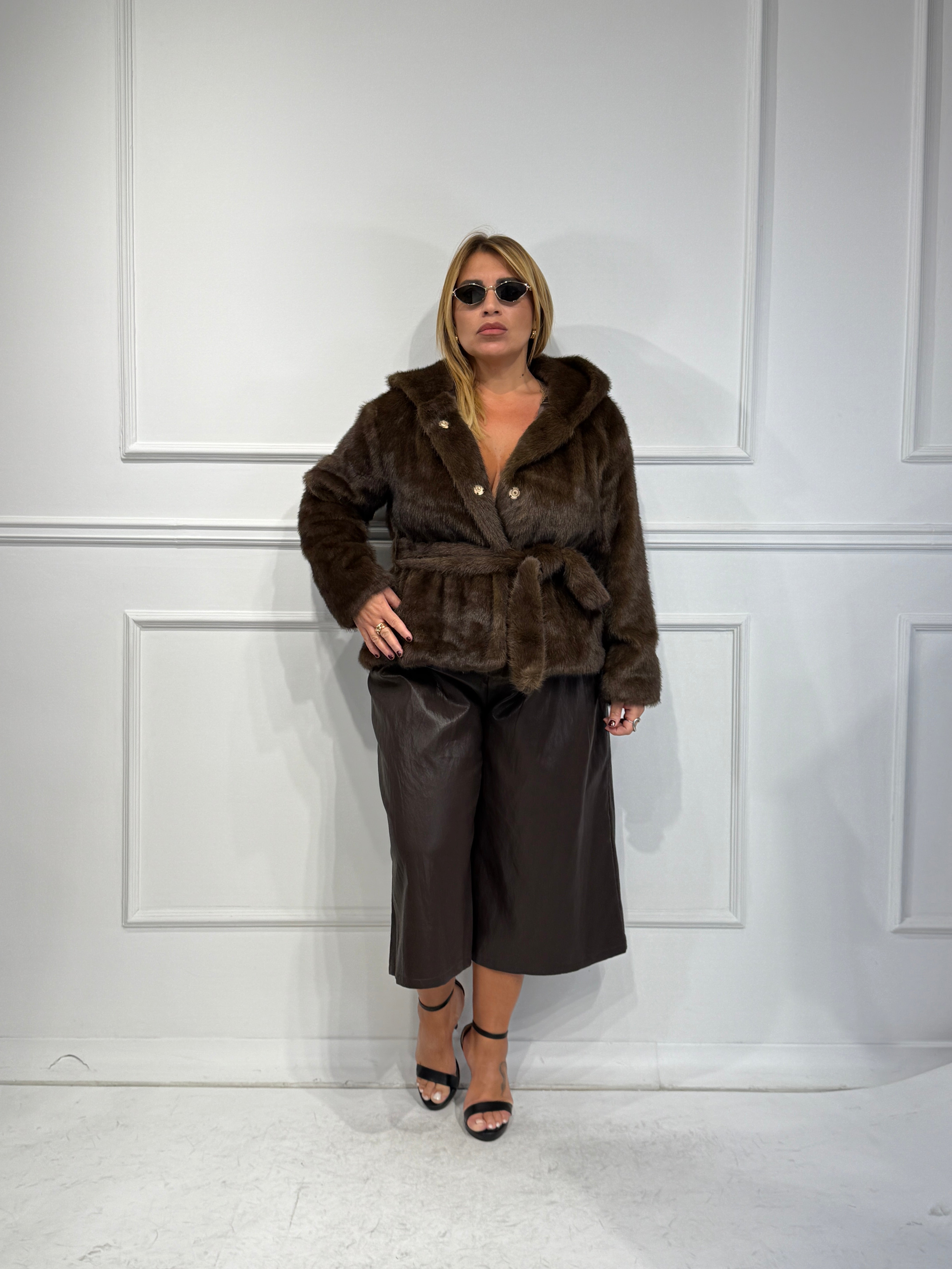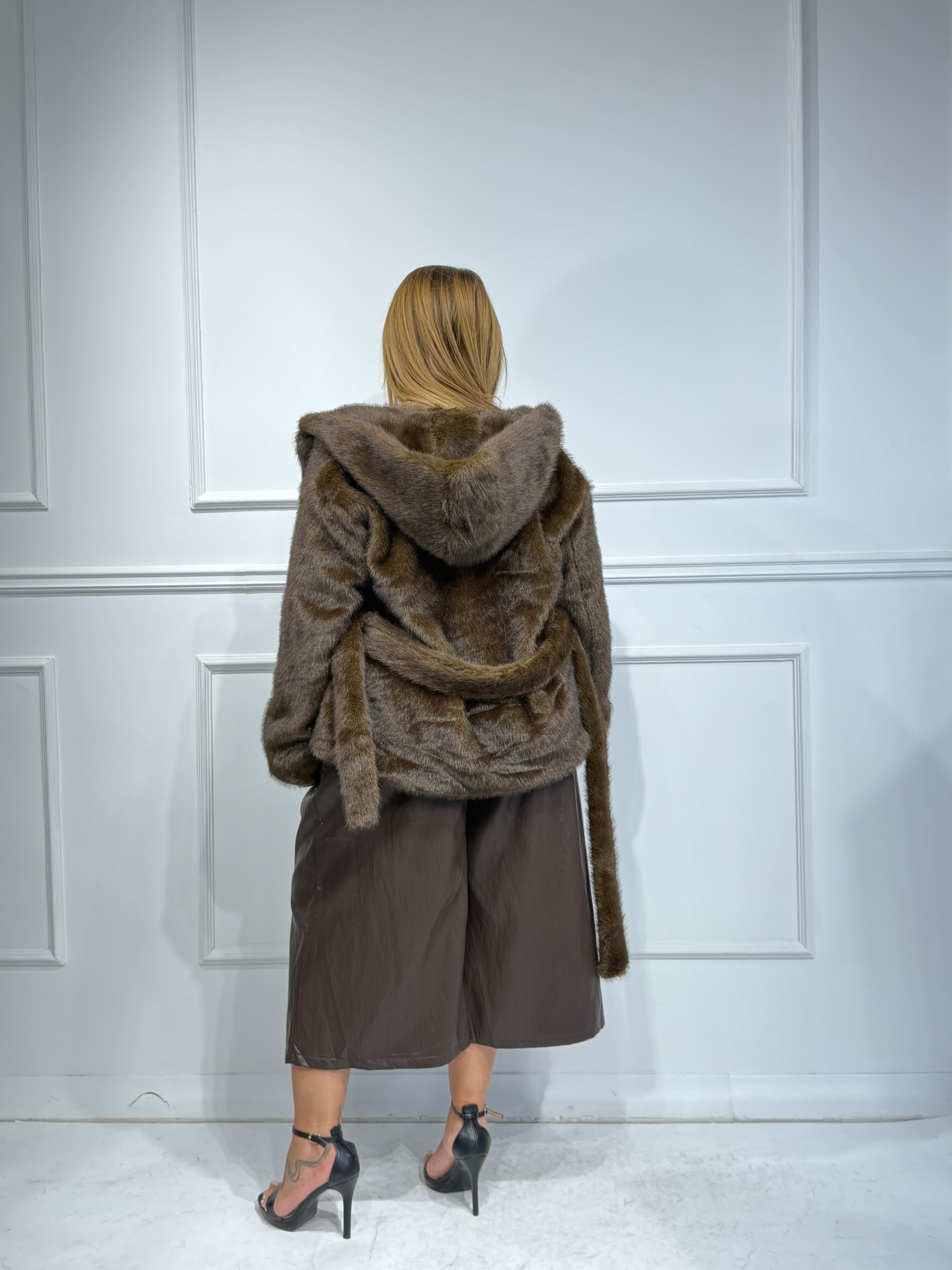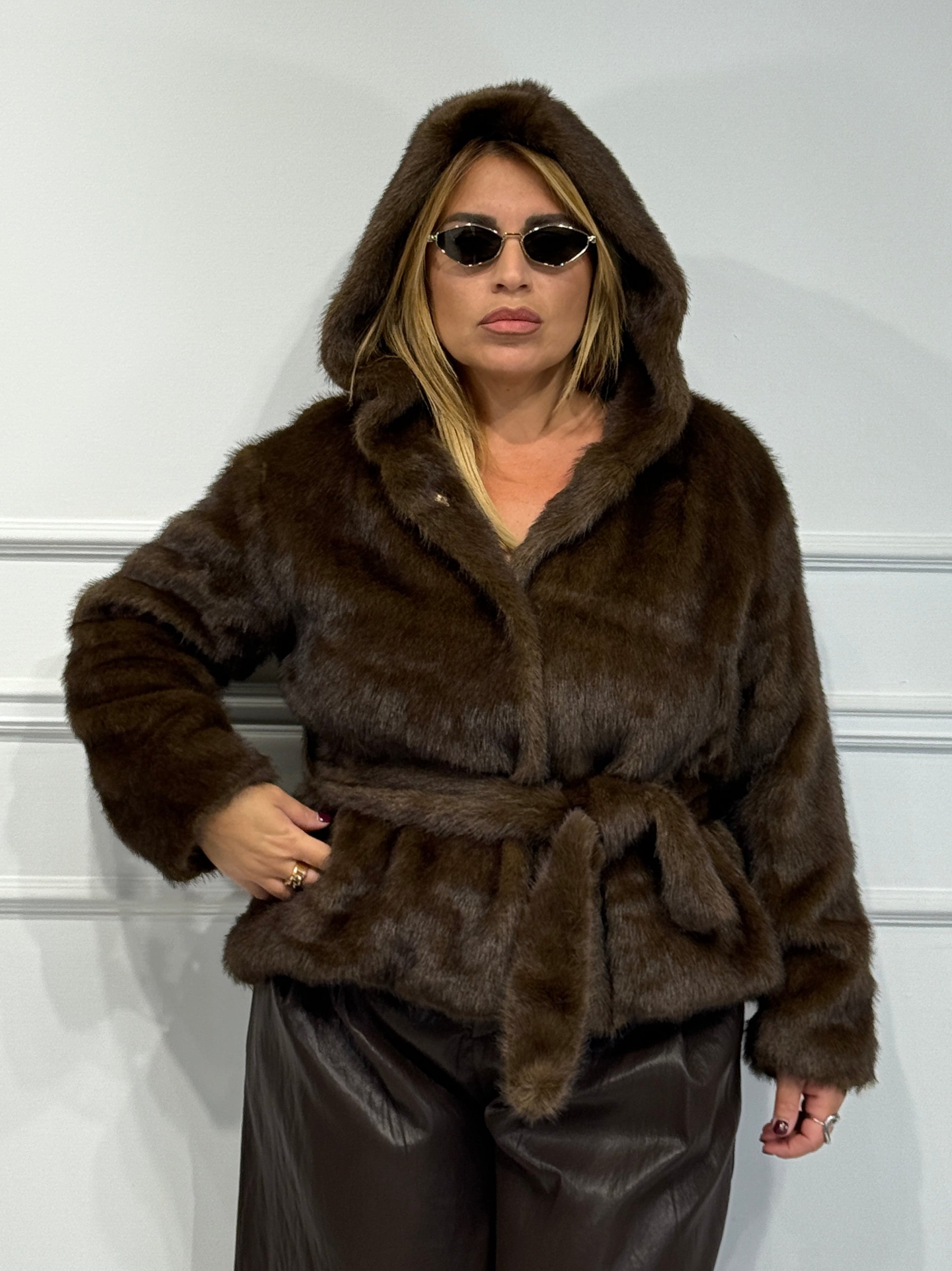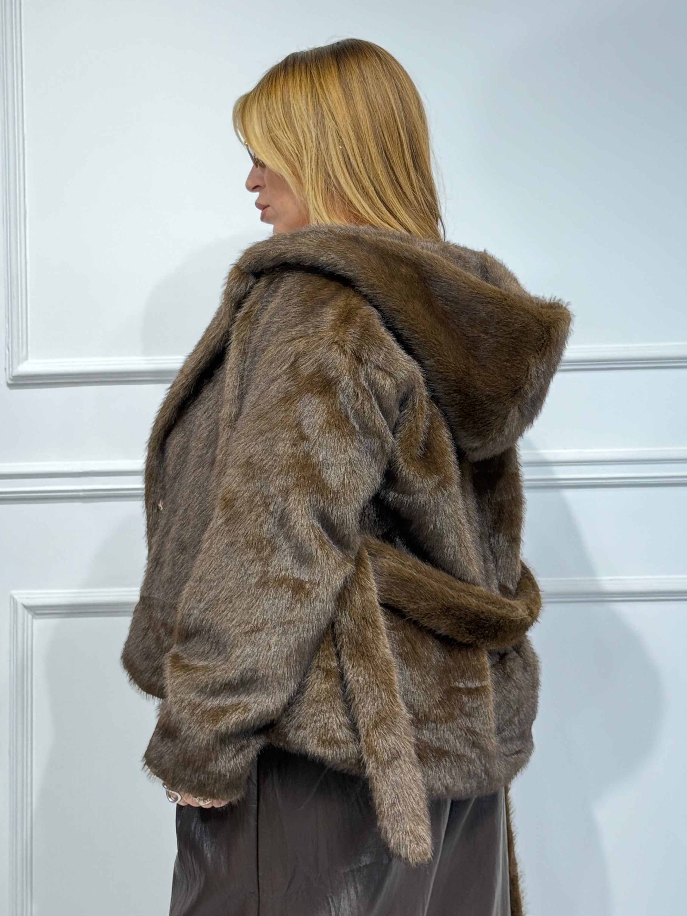 Pelliccia ecologica con ciappe ,cappuccio e cintura in vita