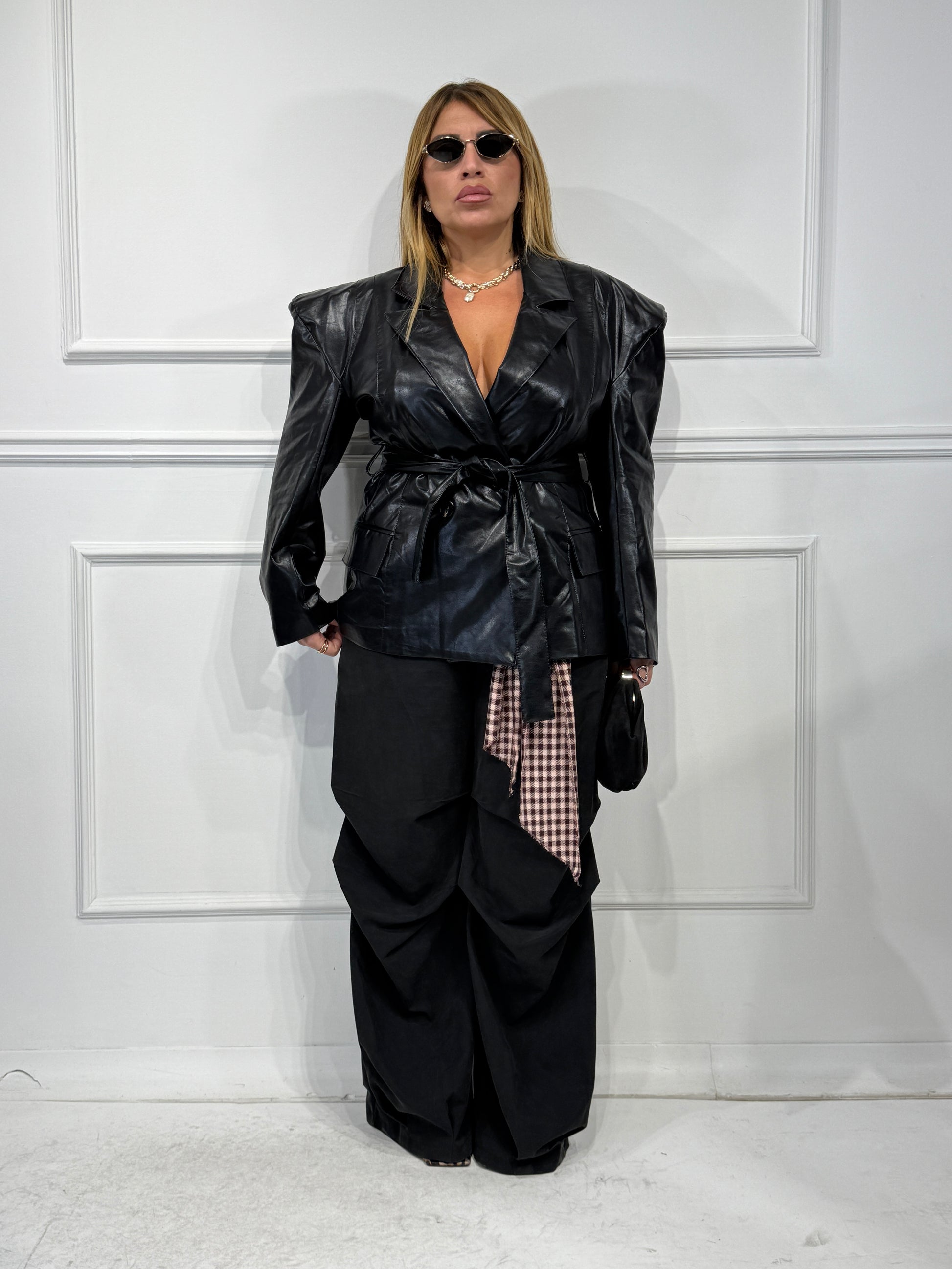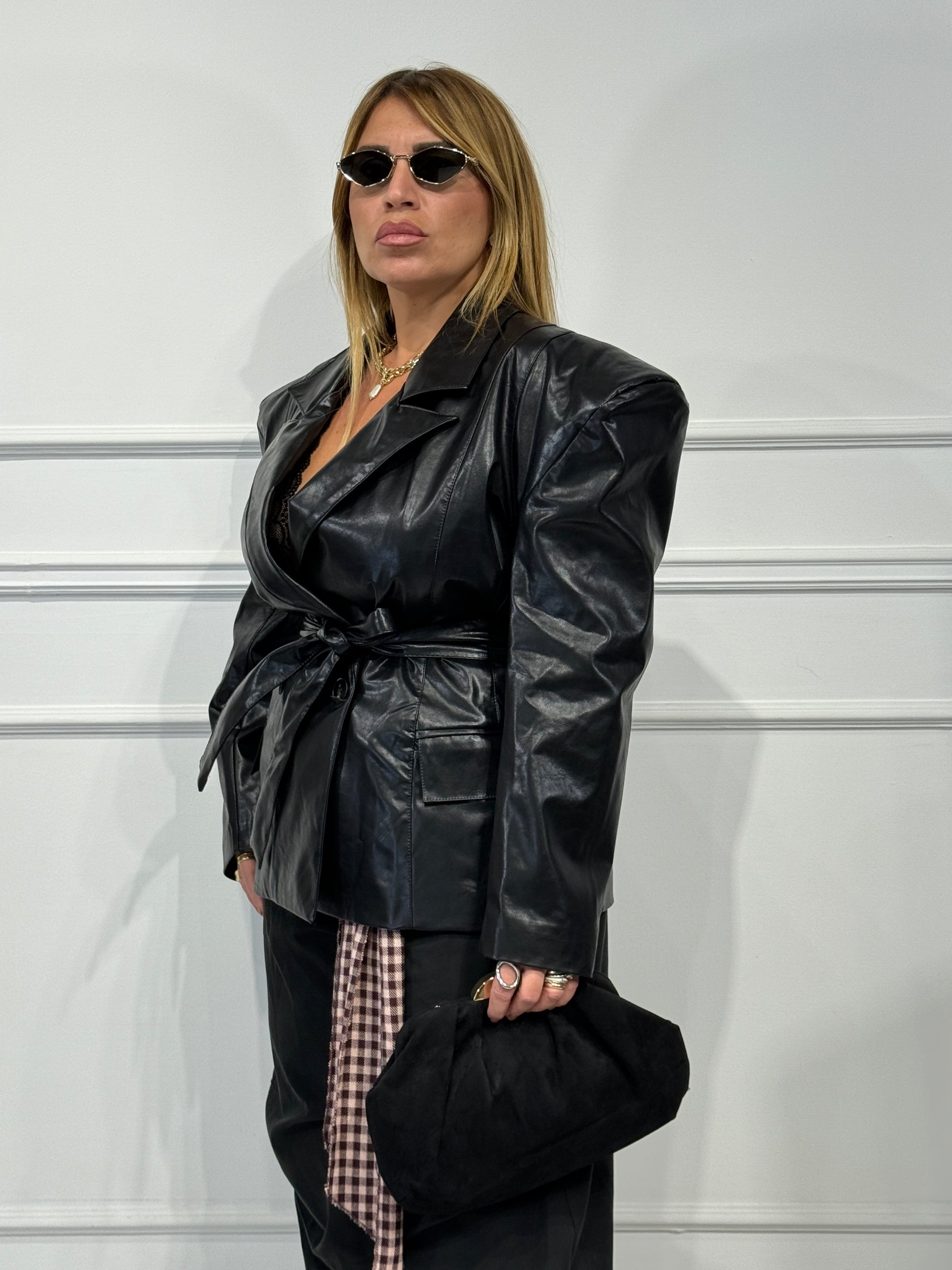 Giacca in ecopelle con spallina molto pronunciata,con cintura in vita