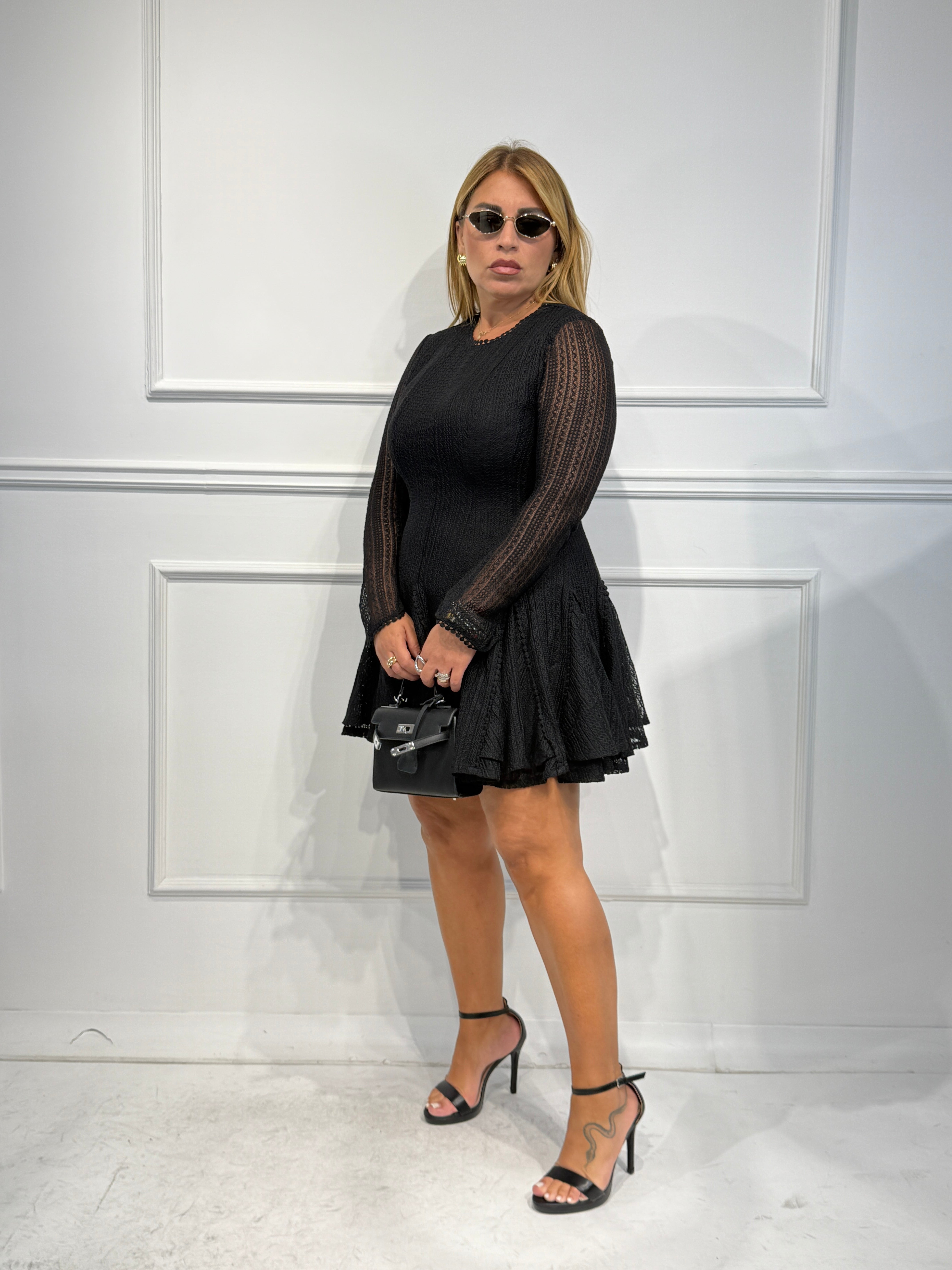 Abito Corto interamente ricamanto,foderato ,con zip sul retro manica trasparente .Disponibile taglia SM ML