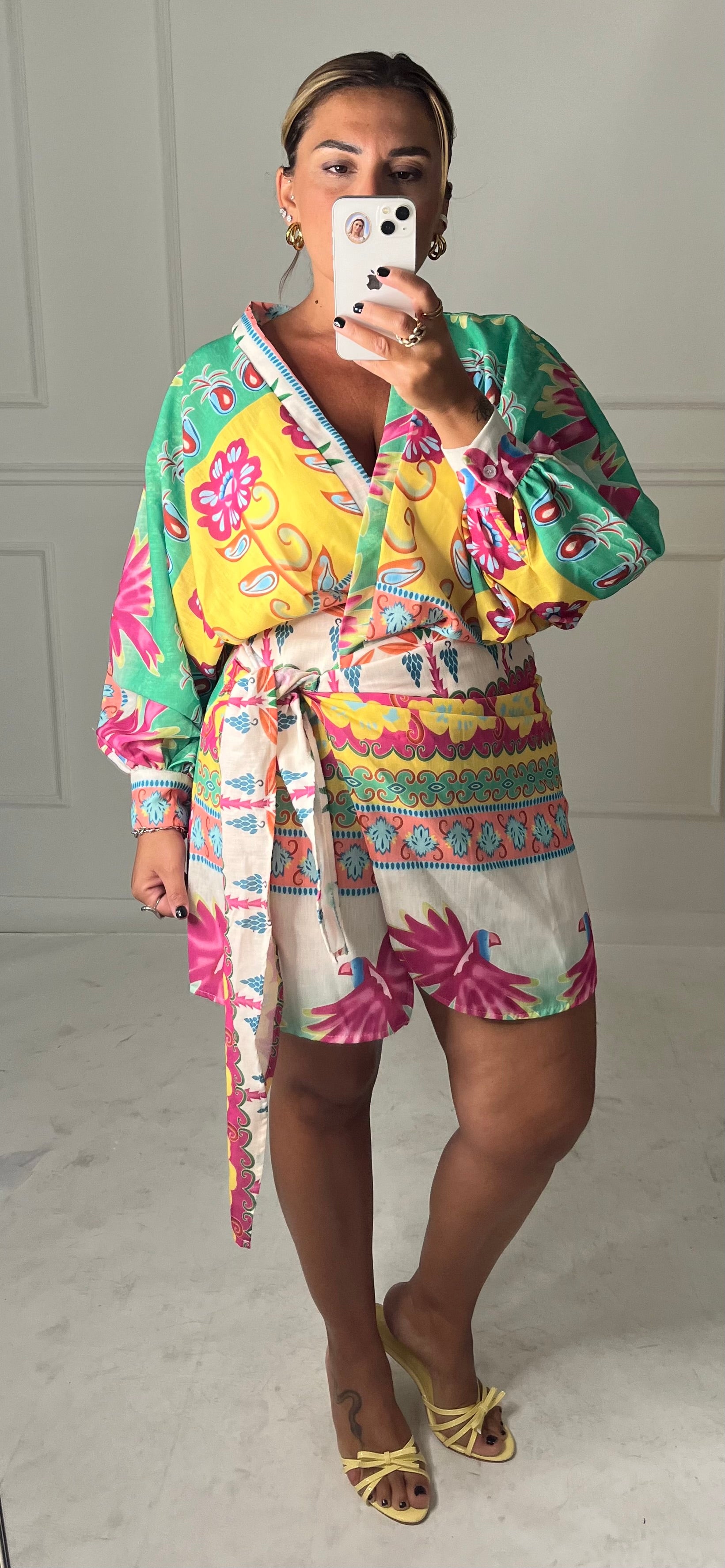 Abito in cotone con stampa, manica lunga, a portafoglio