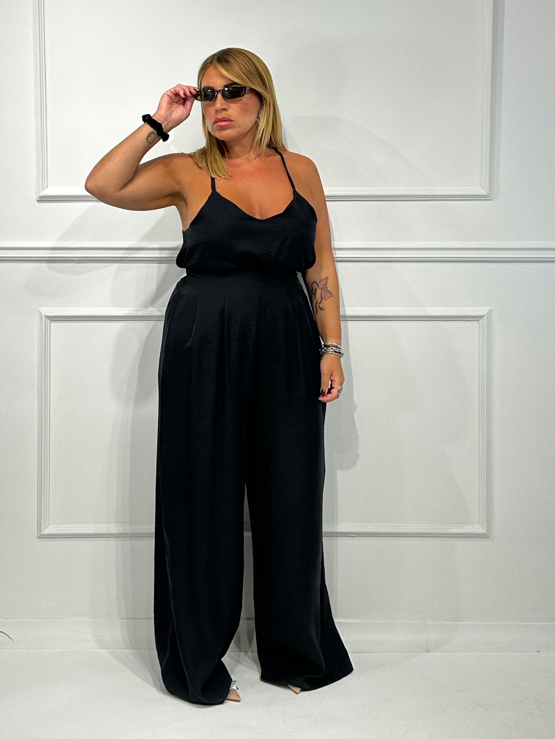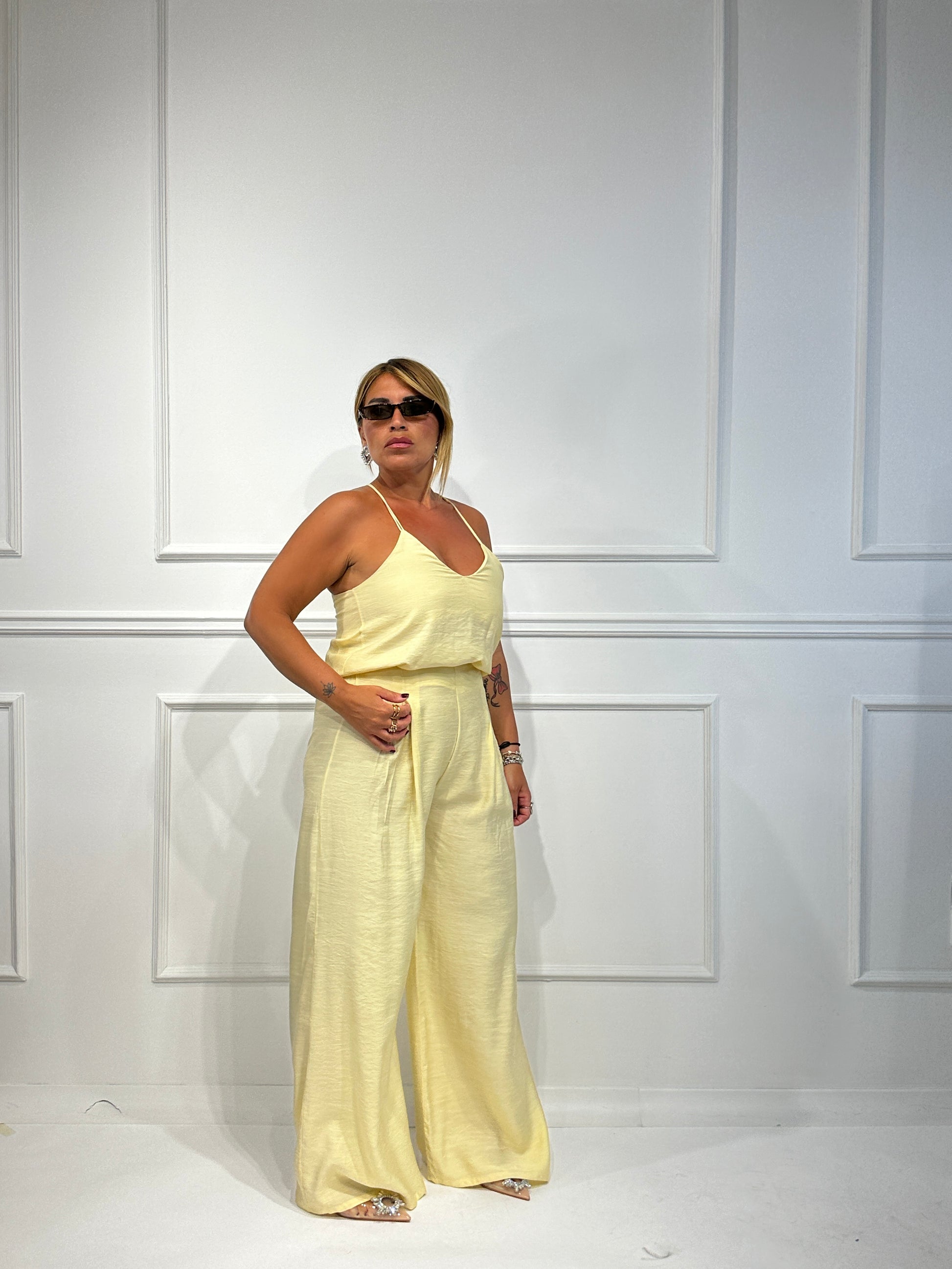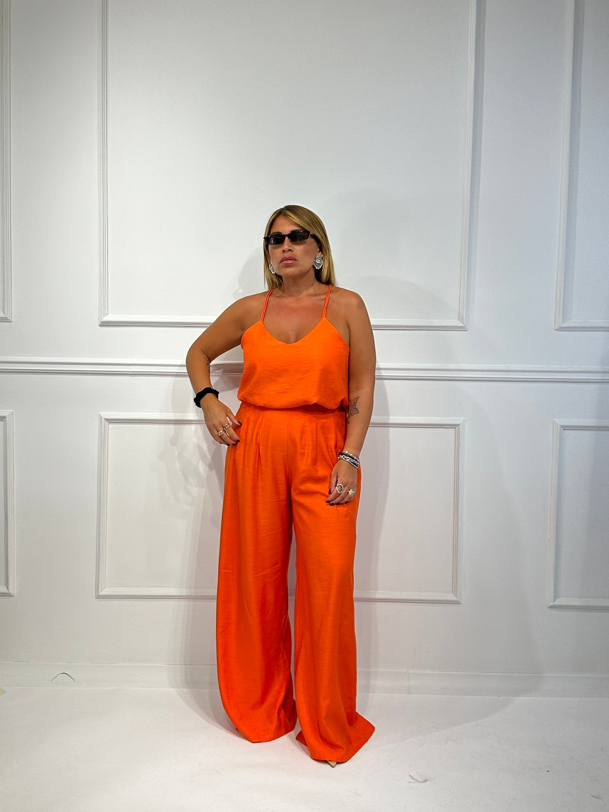 Coordinato composto da top con scollo all'americana,pantalone palazzo con bustino semielastico.Colori disponibili Nero,Bianco,Arancio,Giallo.