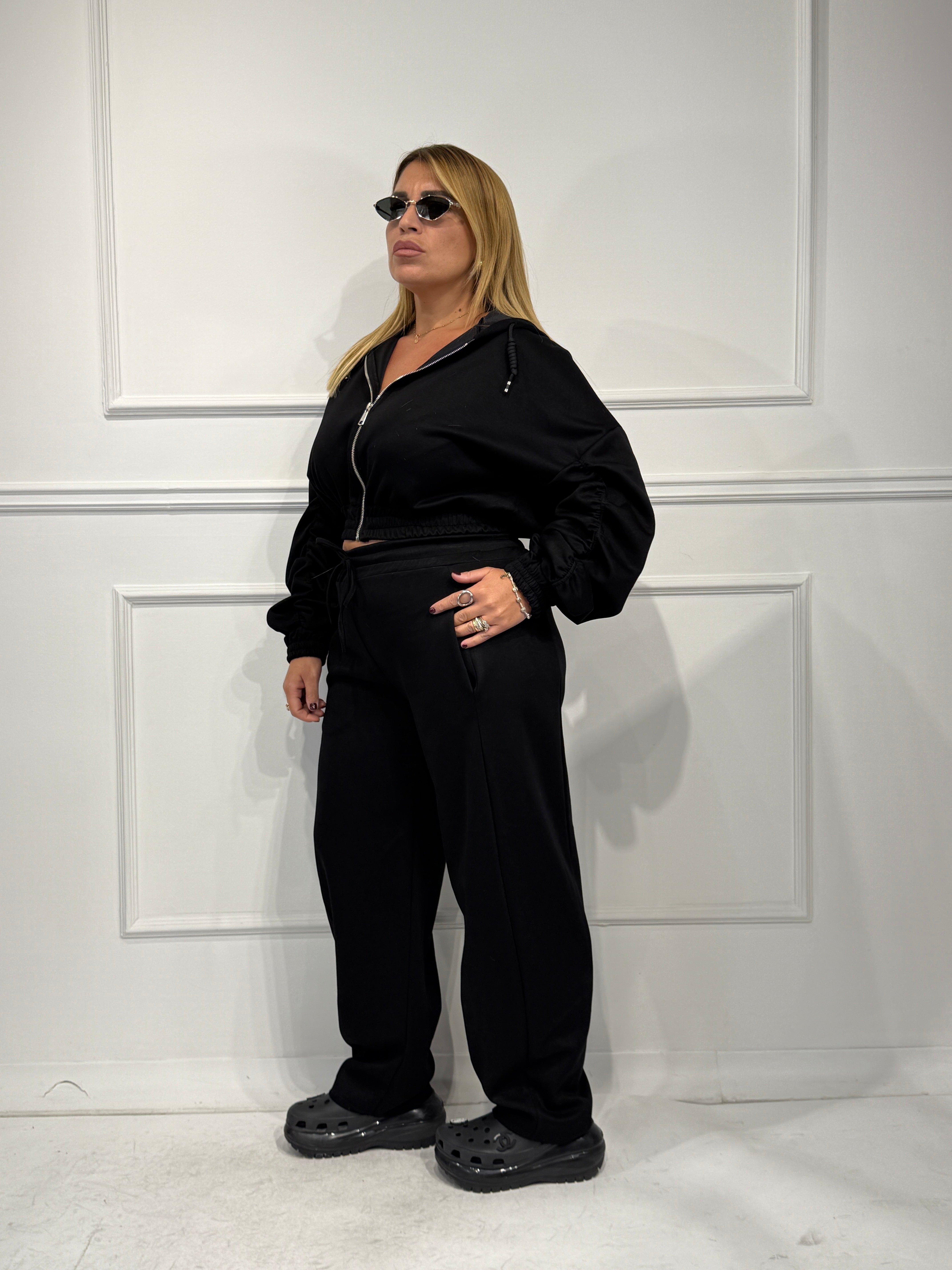 Coordinato composto da felpa cropped con zip e cappuccio con manica drappeggiata e pantalone con molla regular fit.Taglia unica veste fino ad una 48