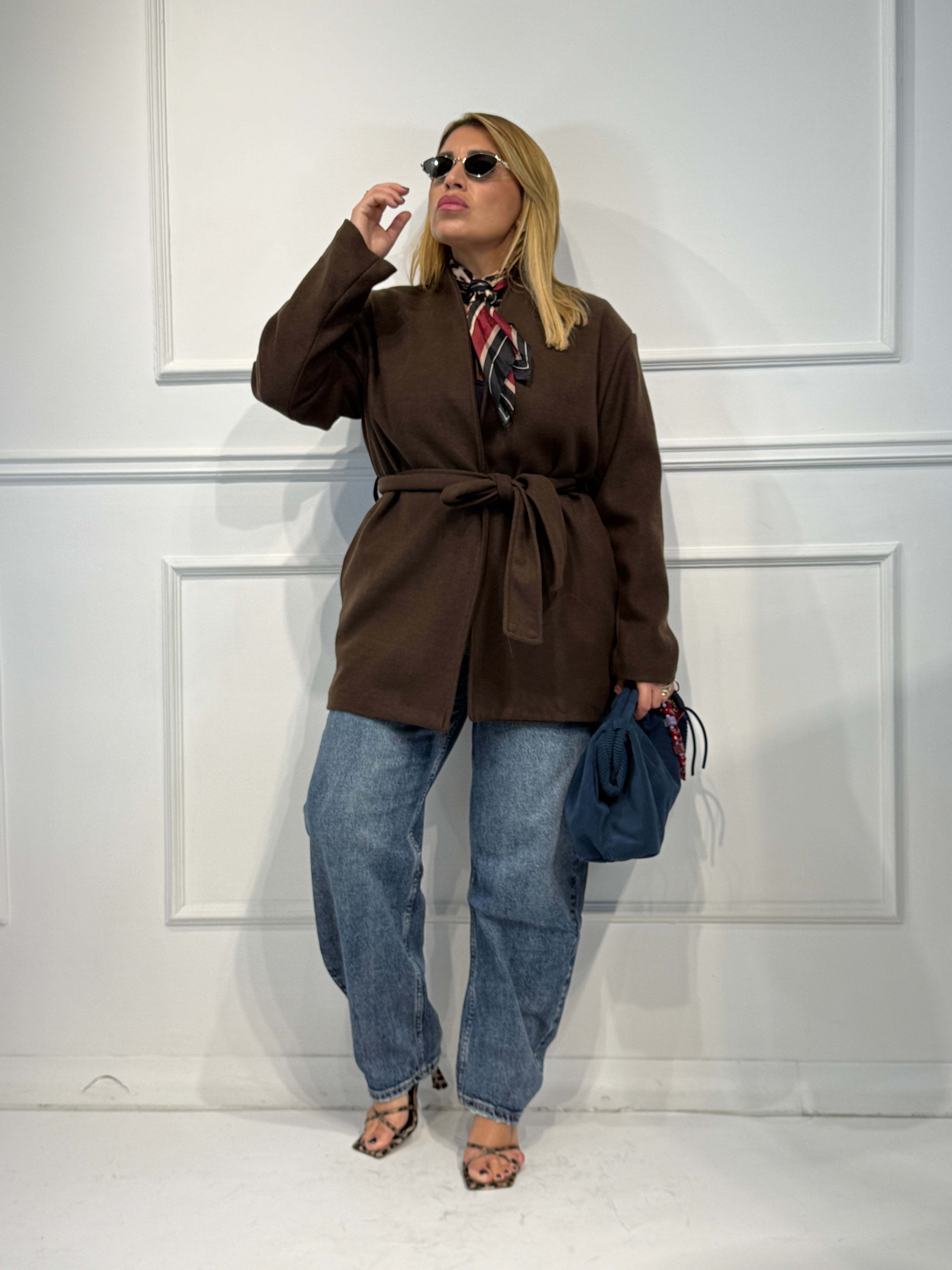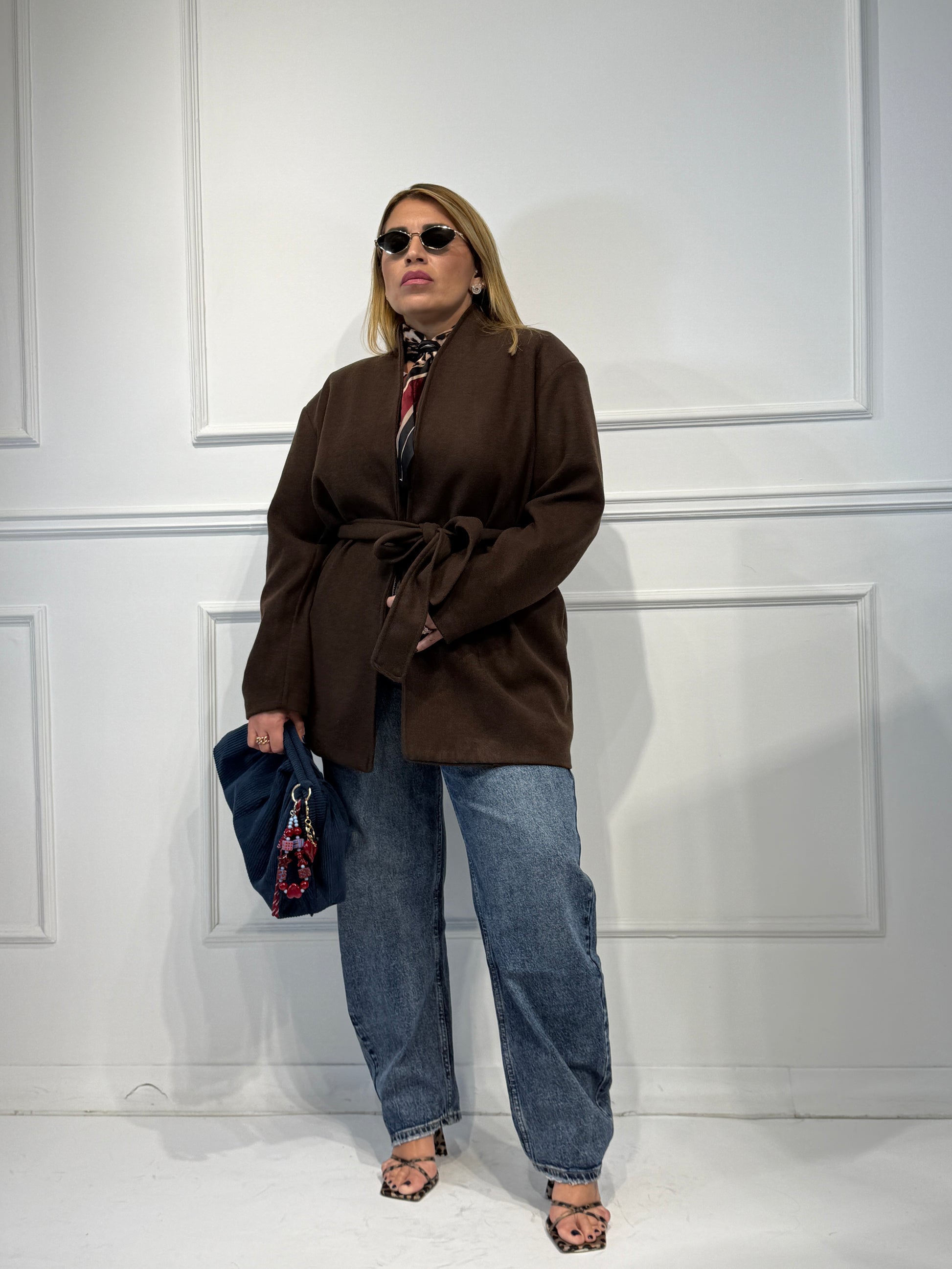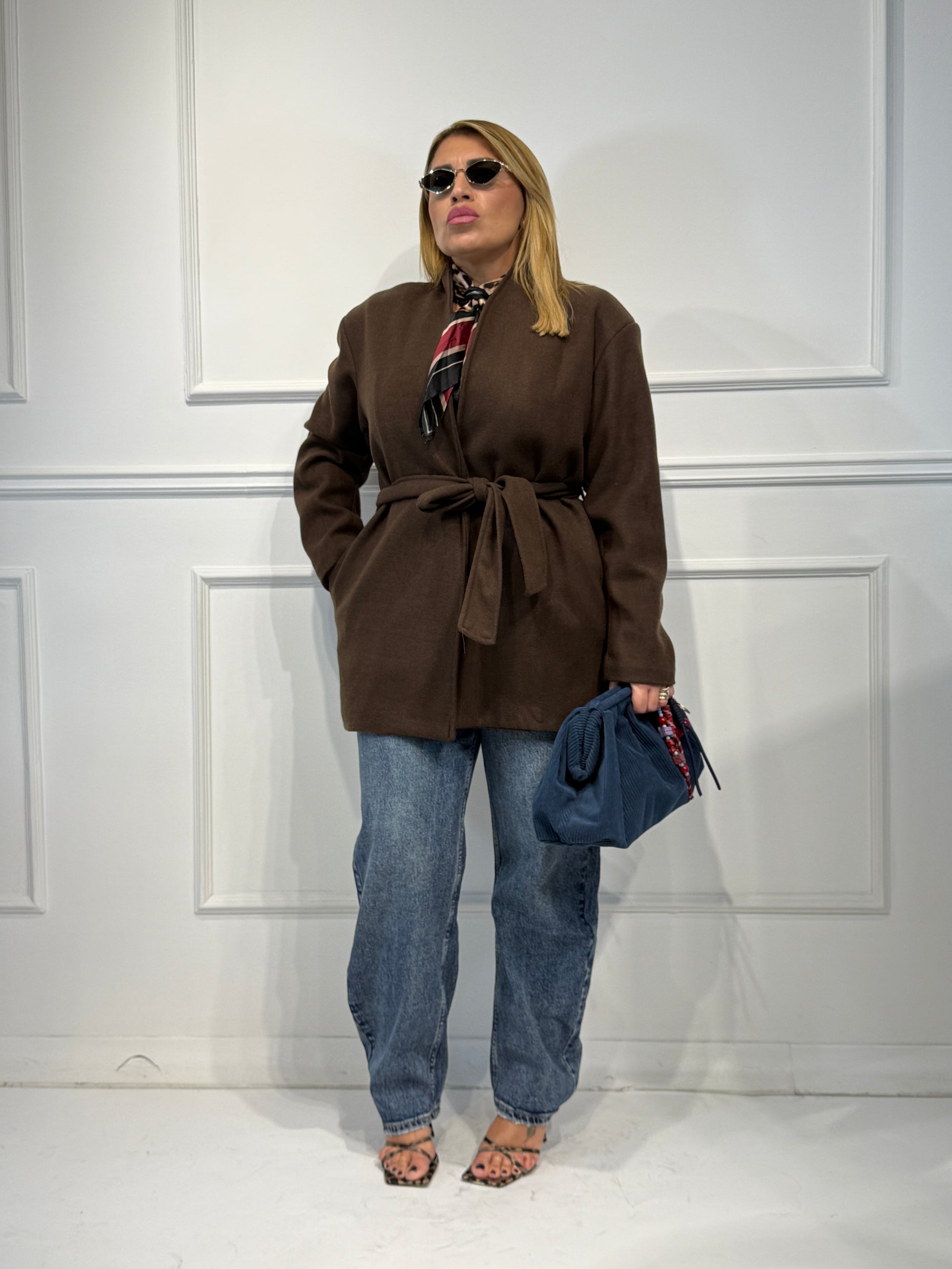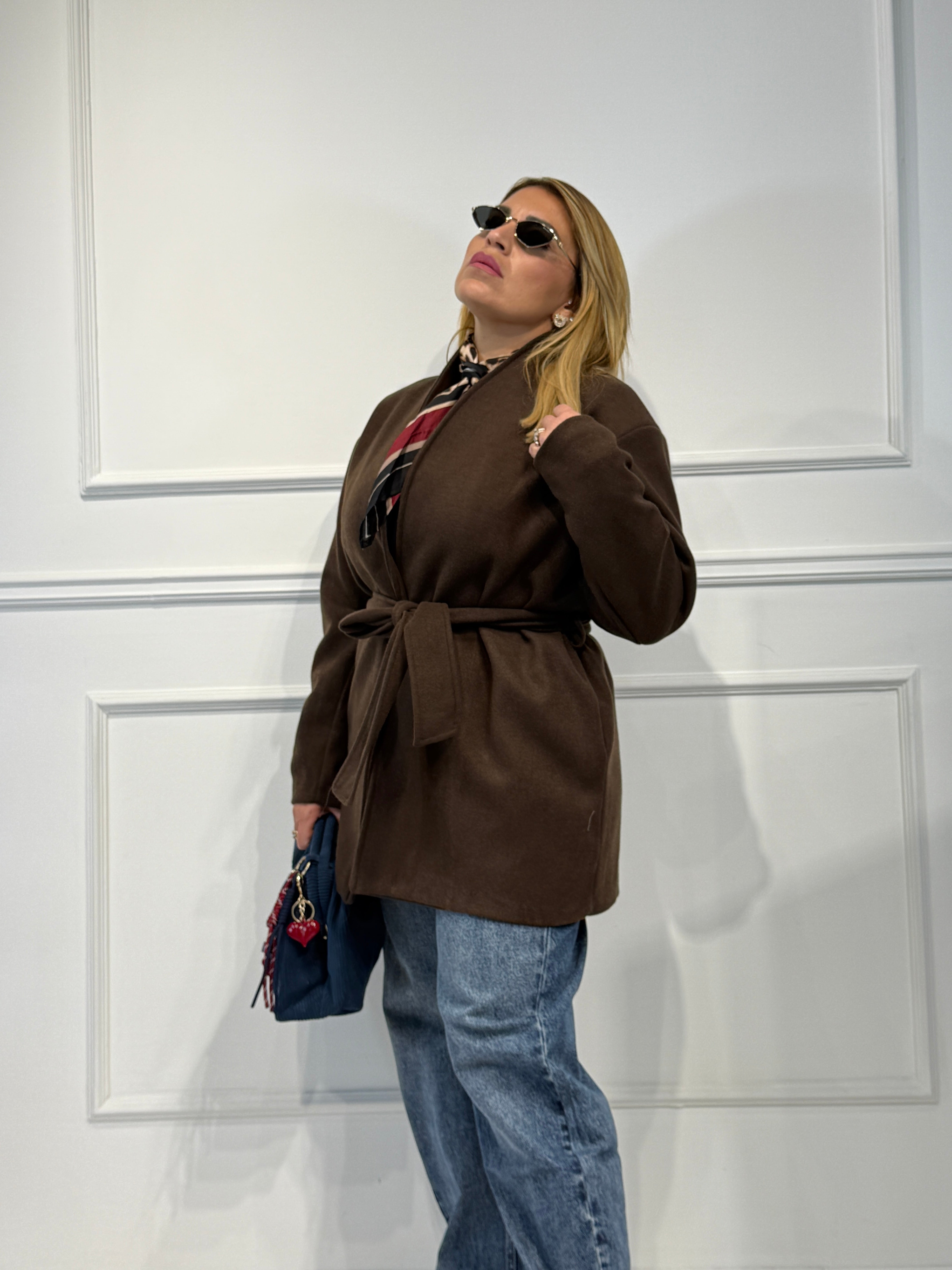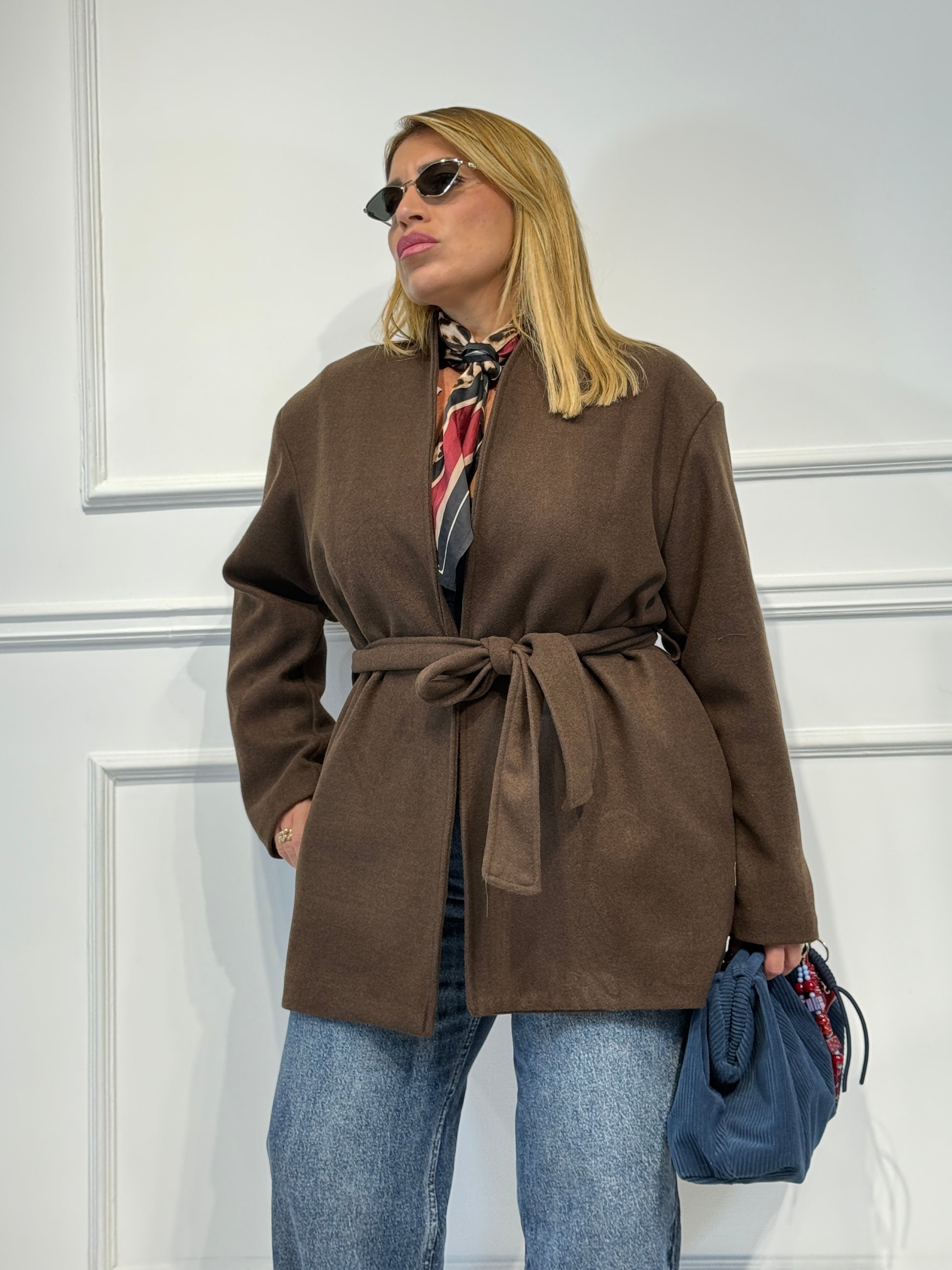 Giacca in panno senza collo senza bottoni con cintura in vita taglia univa veste fino a 48