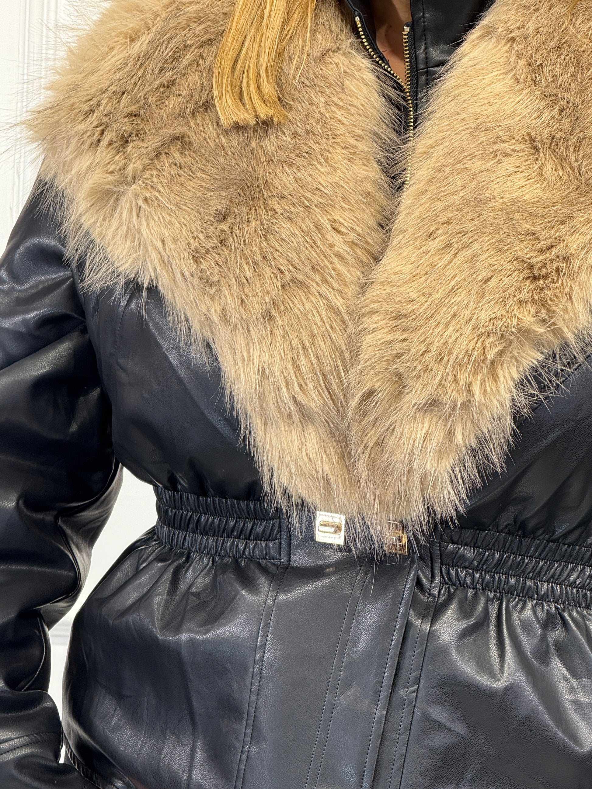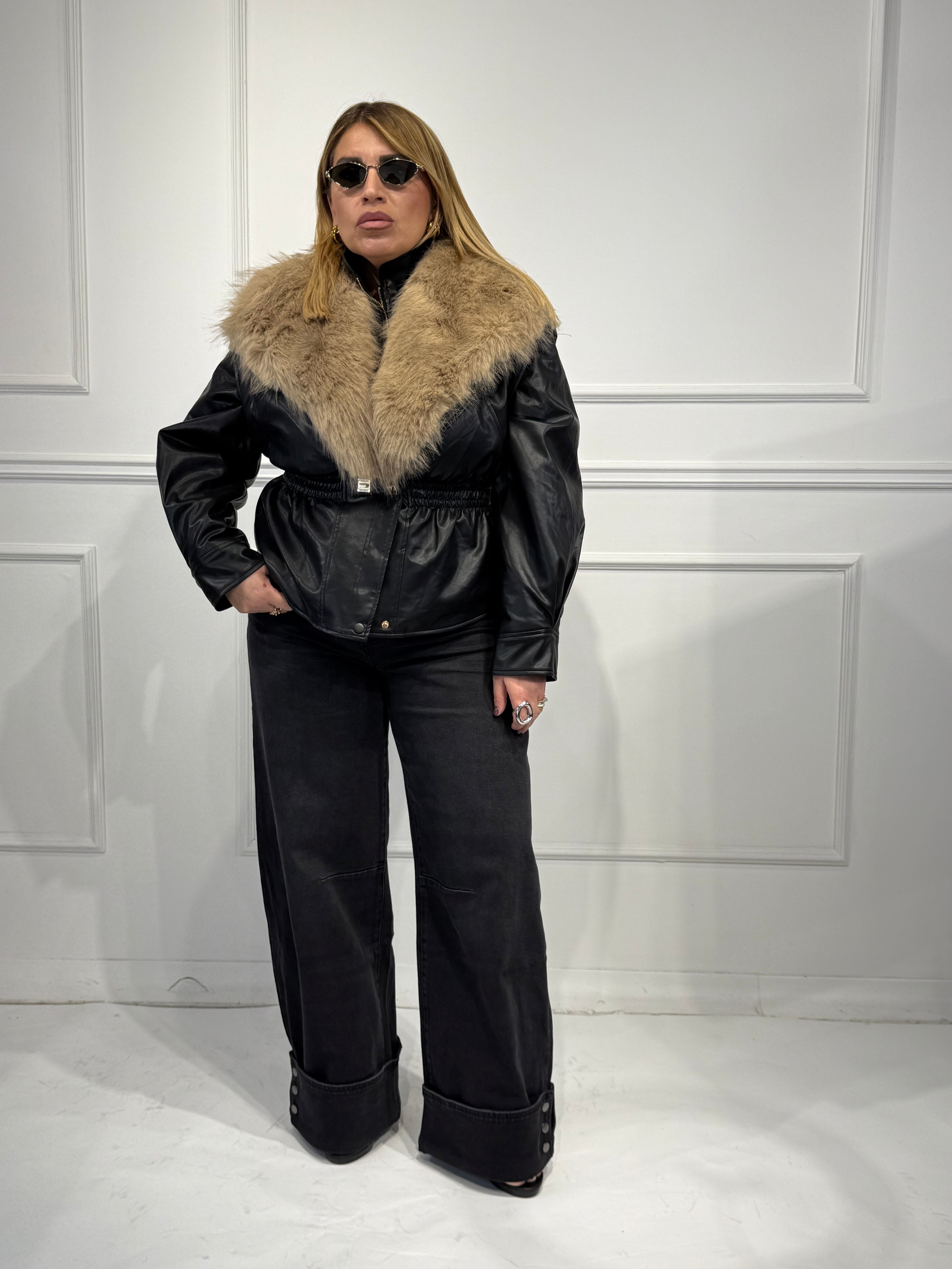 Giubbino in ecopelle con doppia abbottonatura,collo in ecopellicia color miele removibile ,con imbottitura in pellicetta .