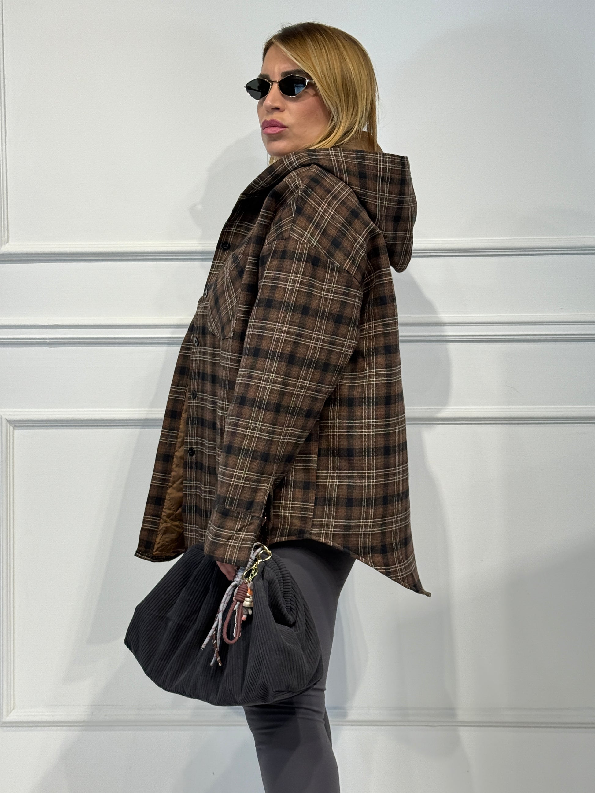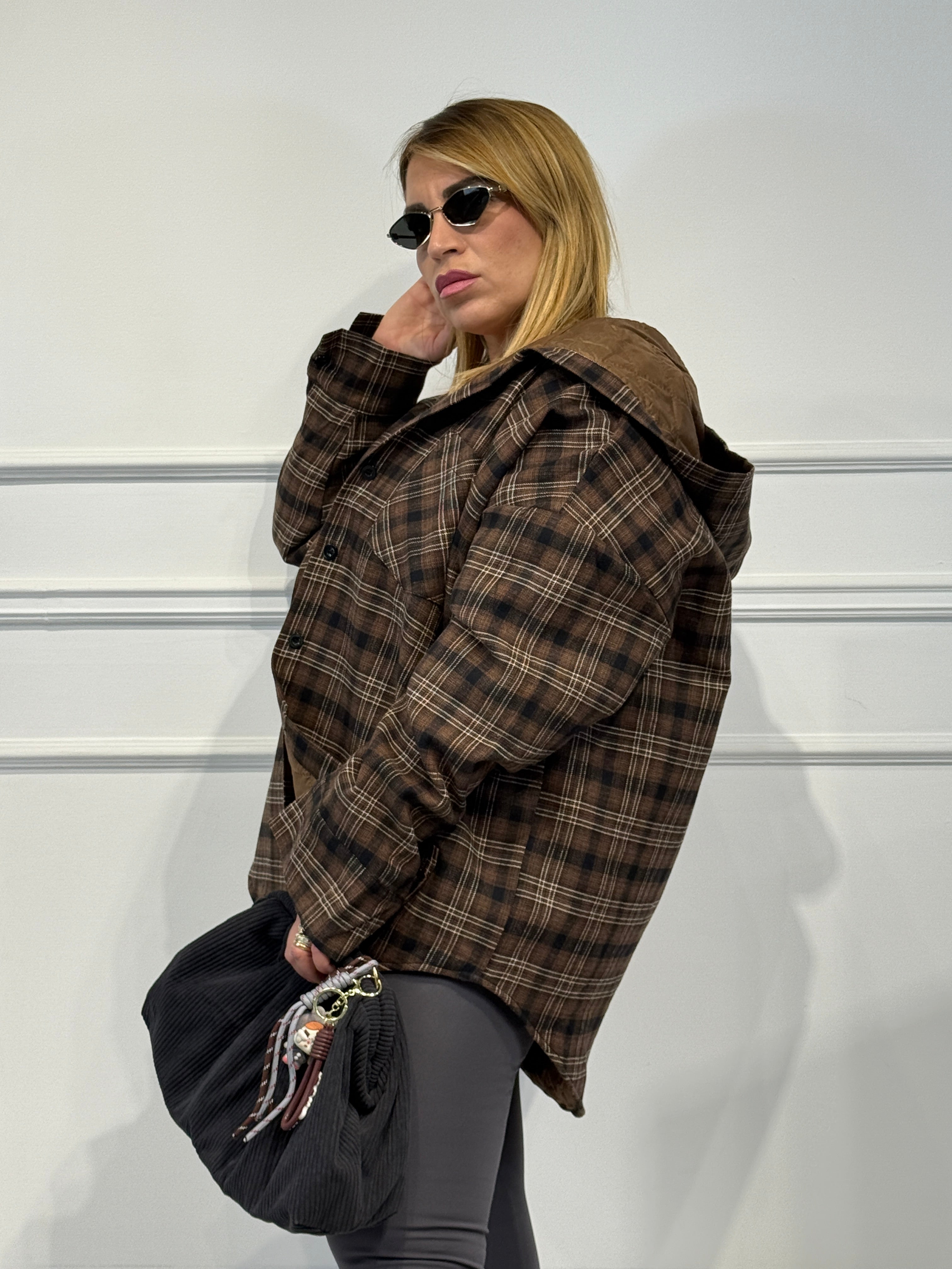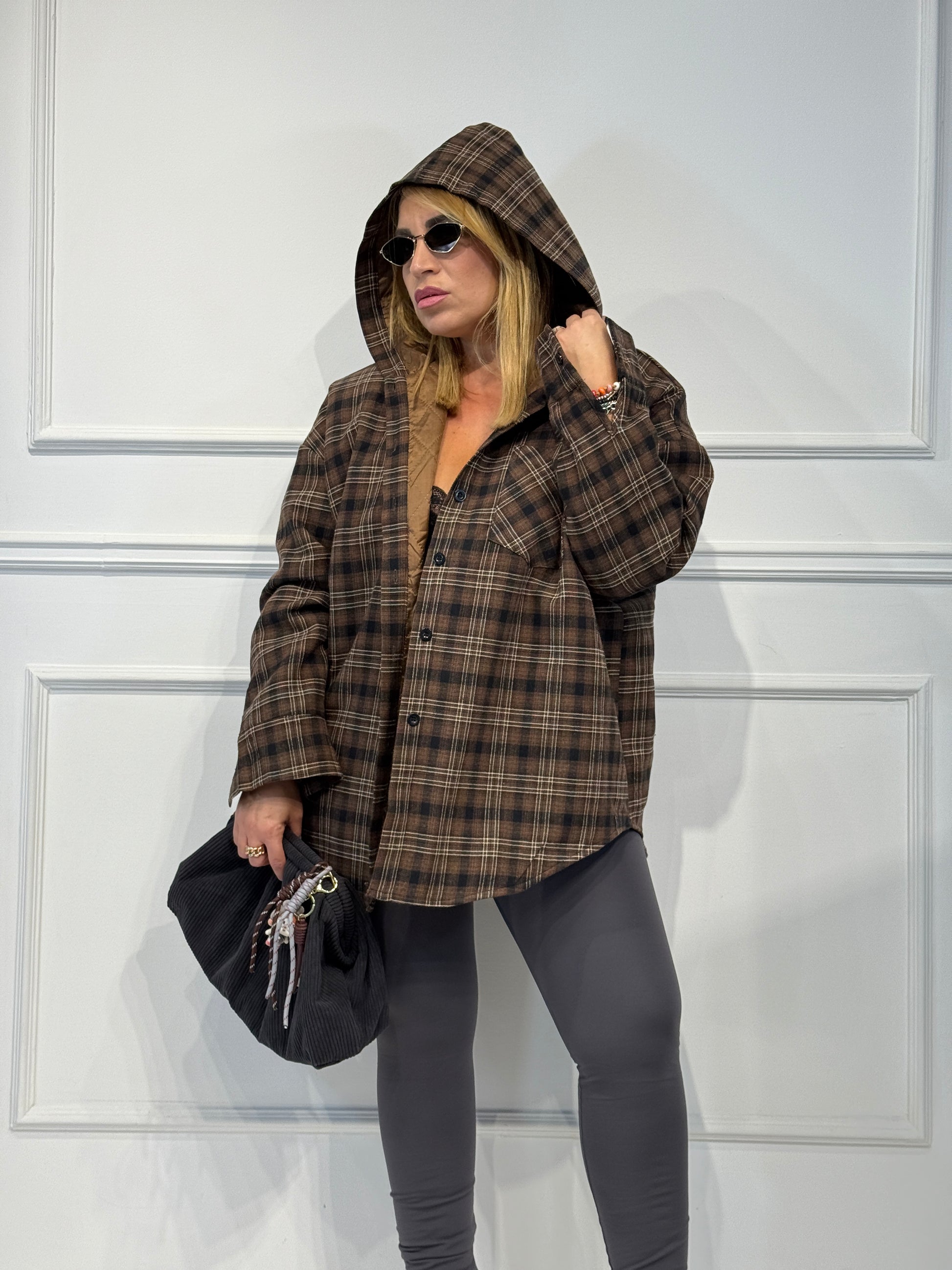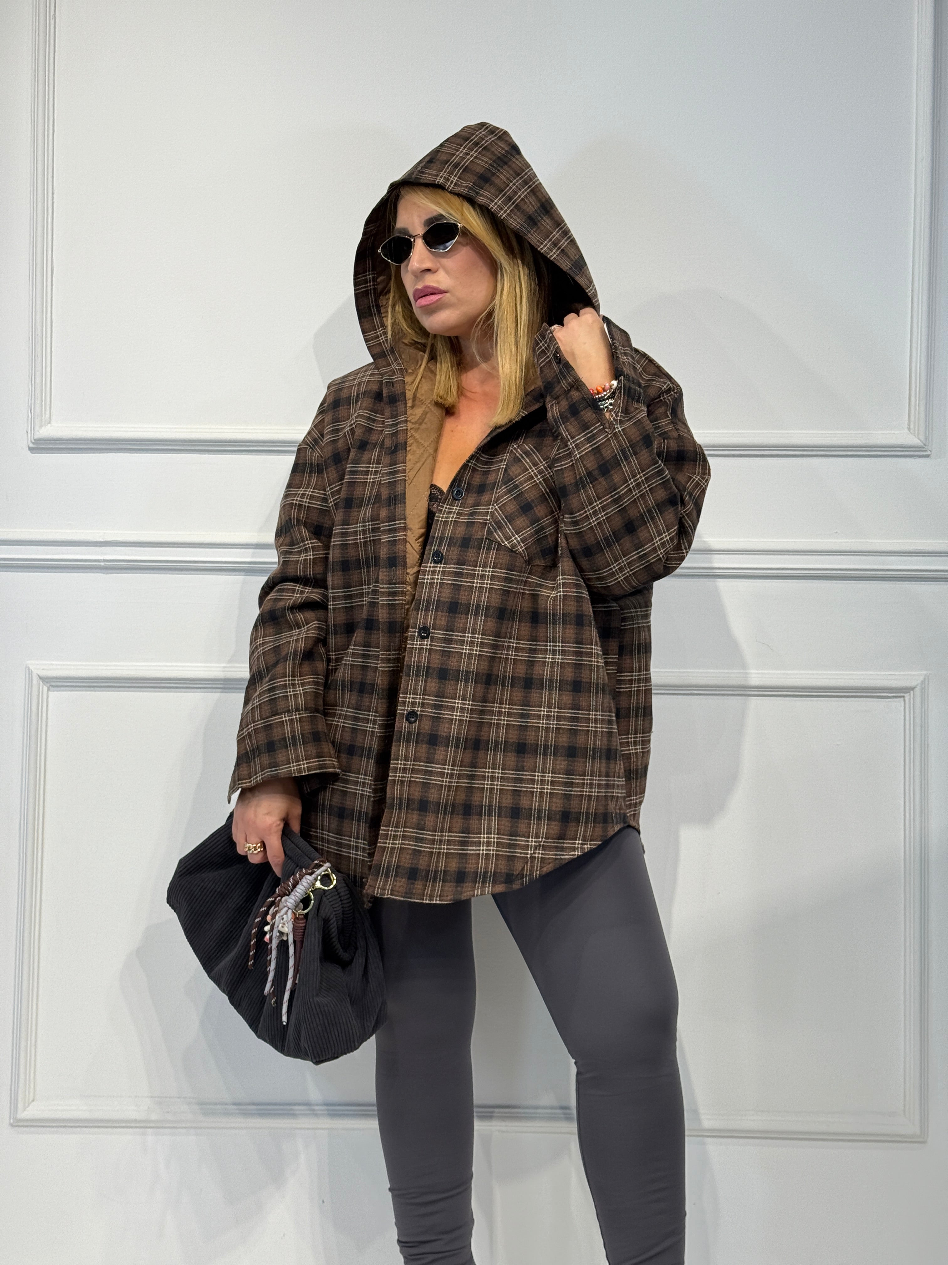 Giubbino con cappuccio camicia,fantasia check,imbottito vestibilita' over size