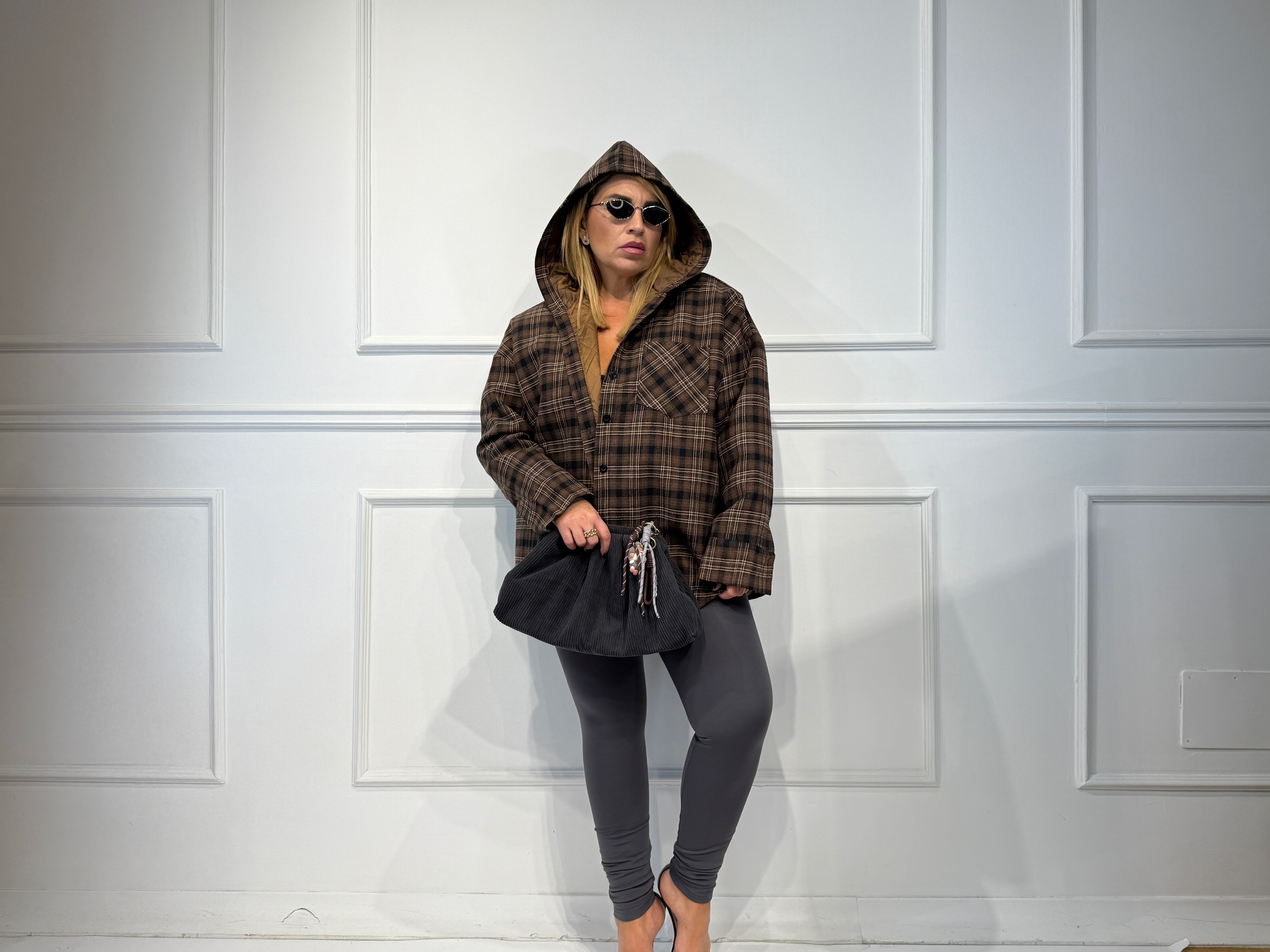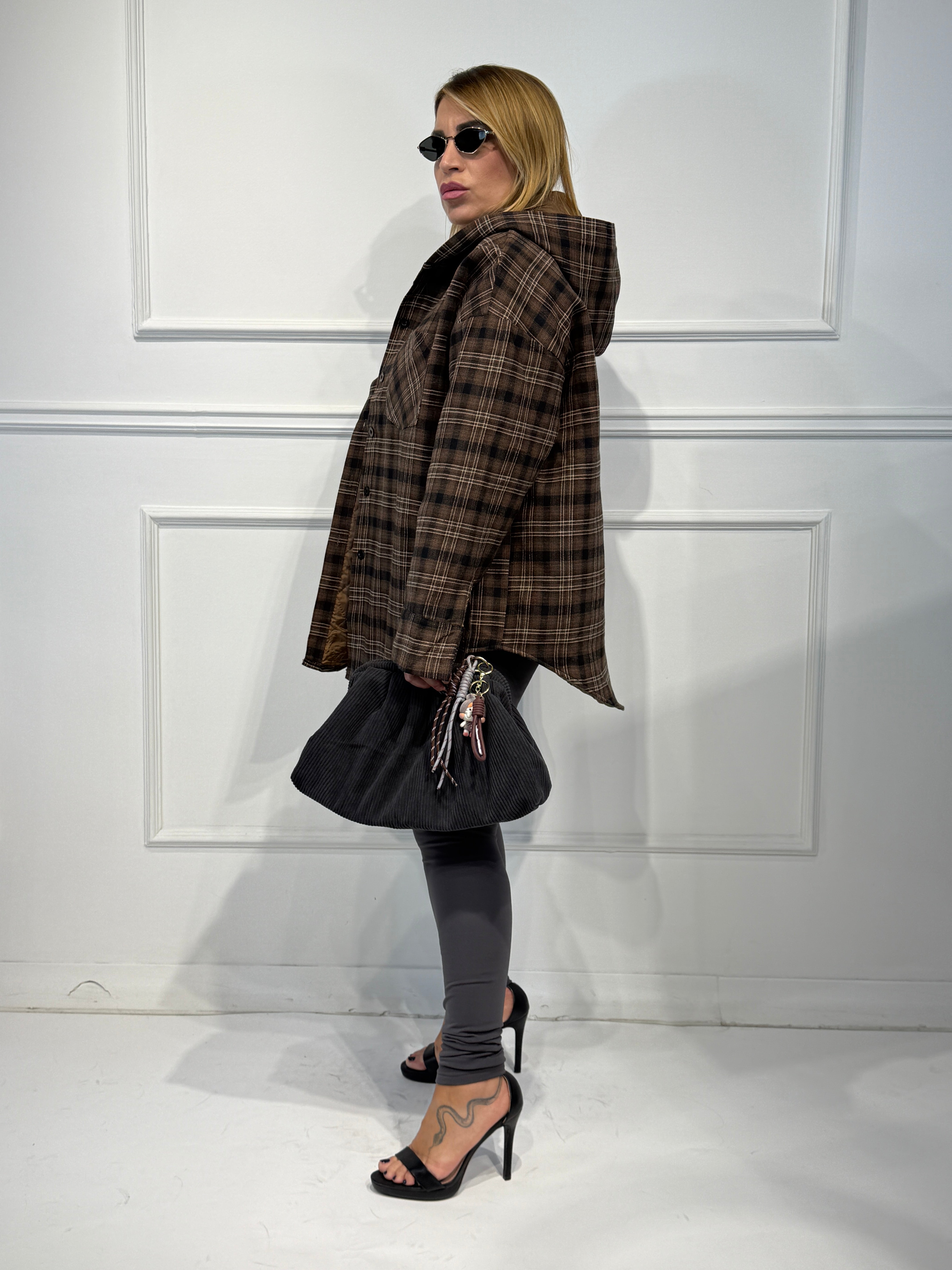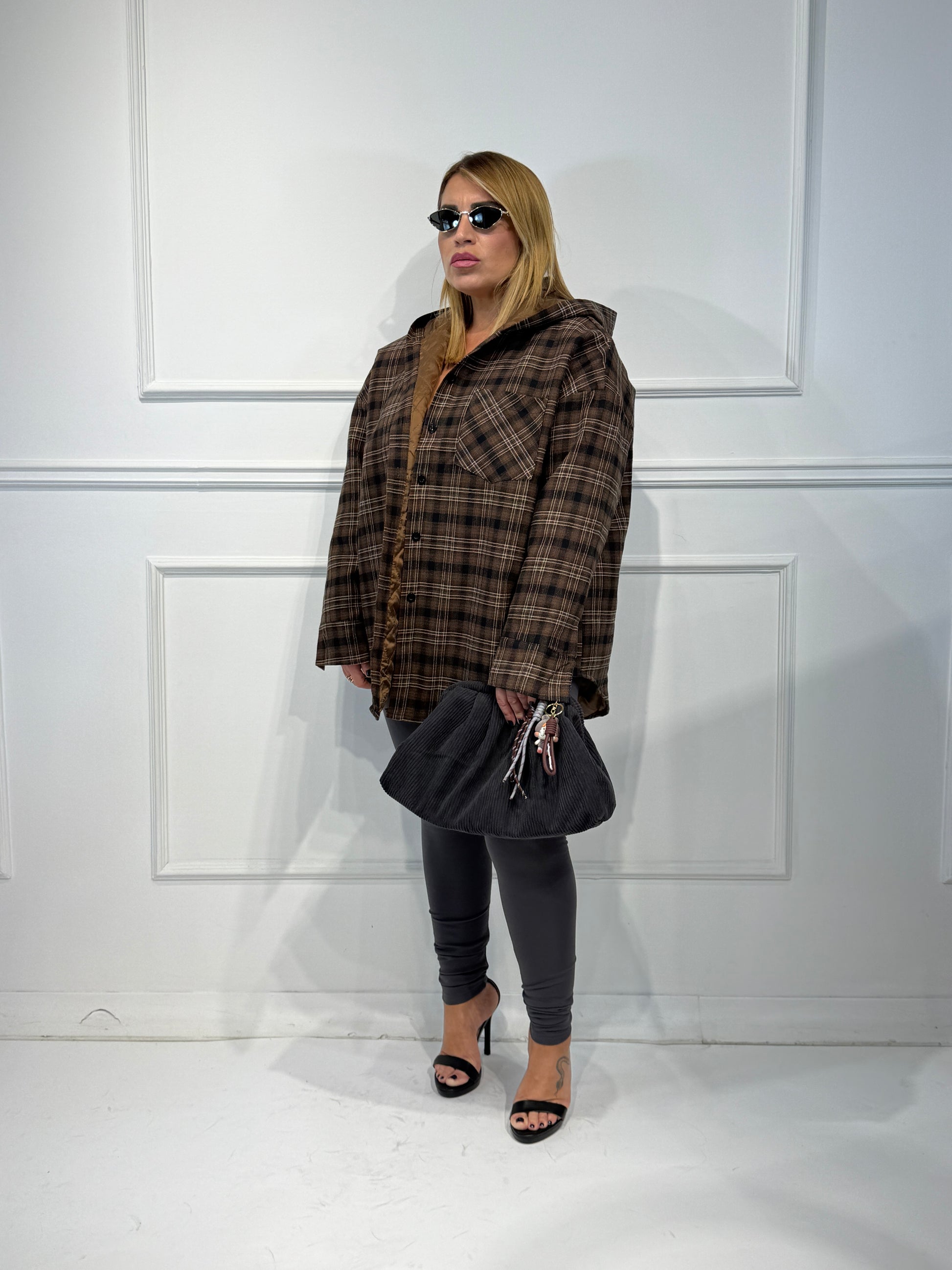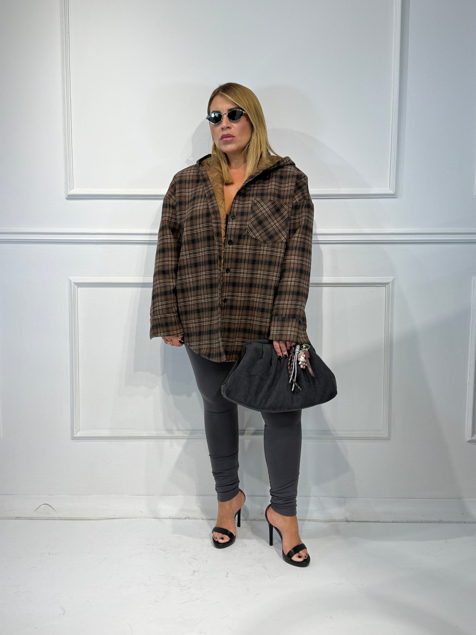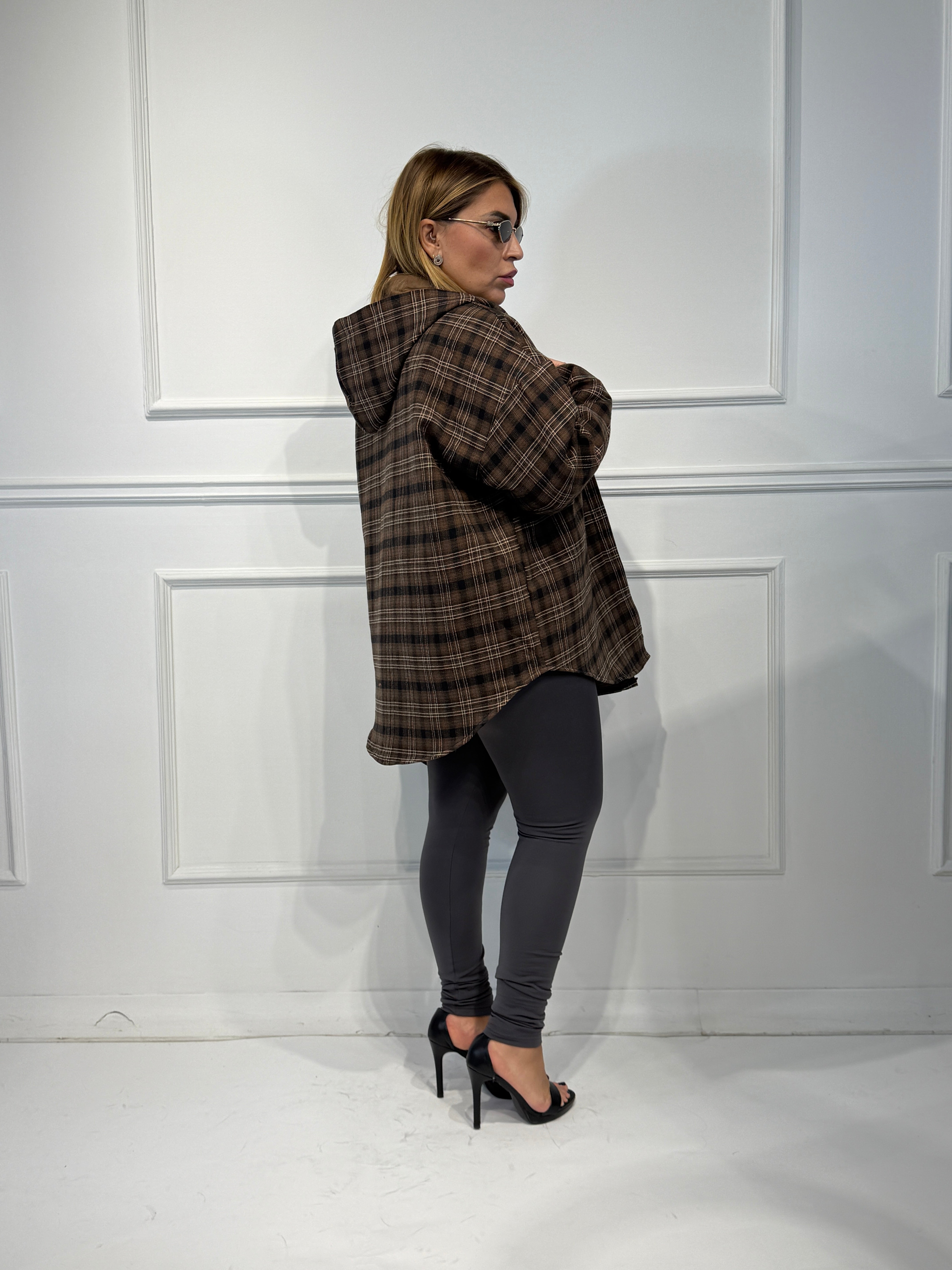 Giubbino con cappuccio camicia,fantasia check,imbottito vestibilita' over size