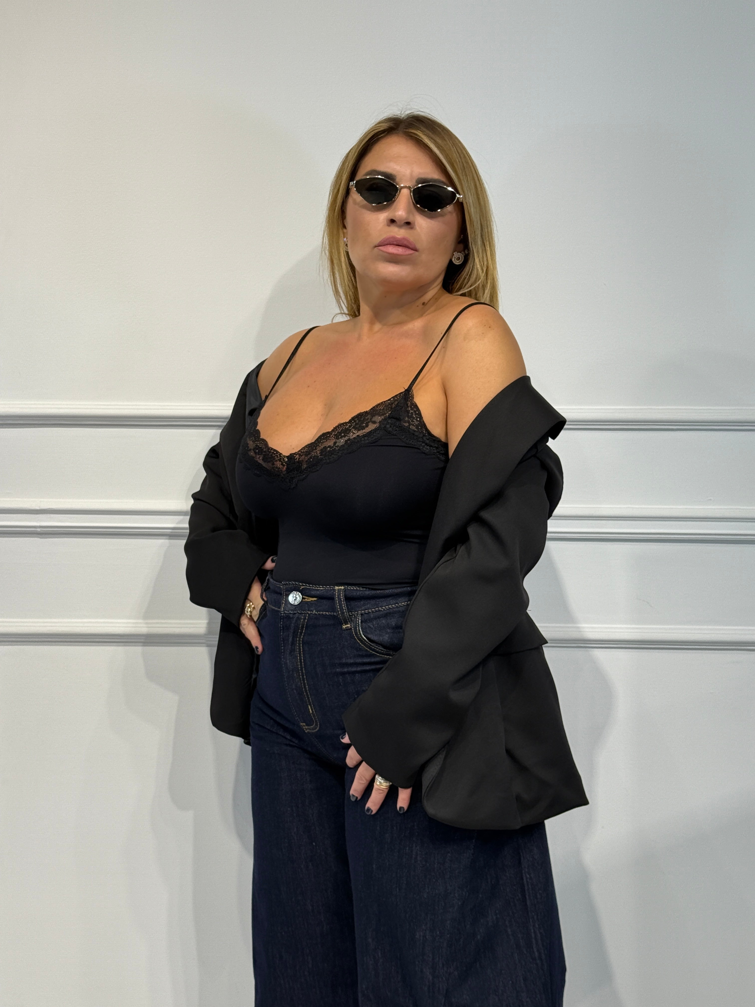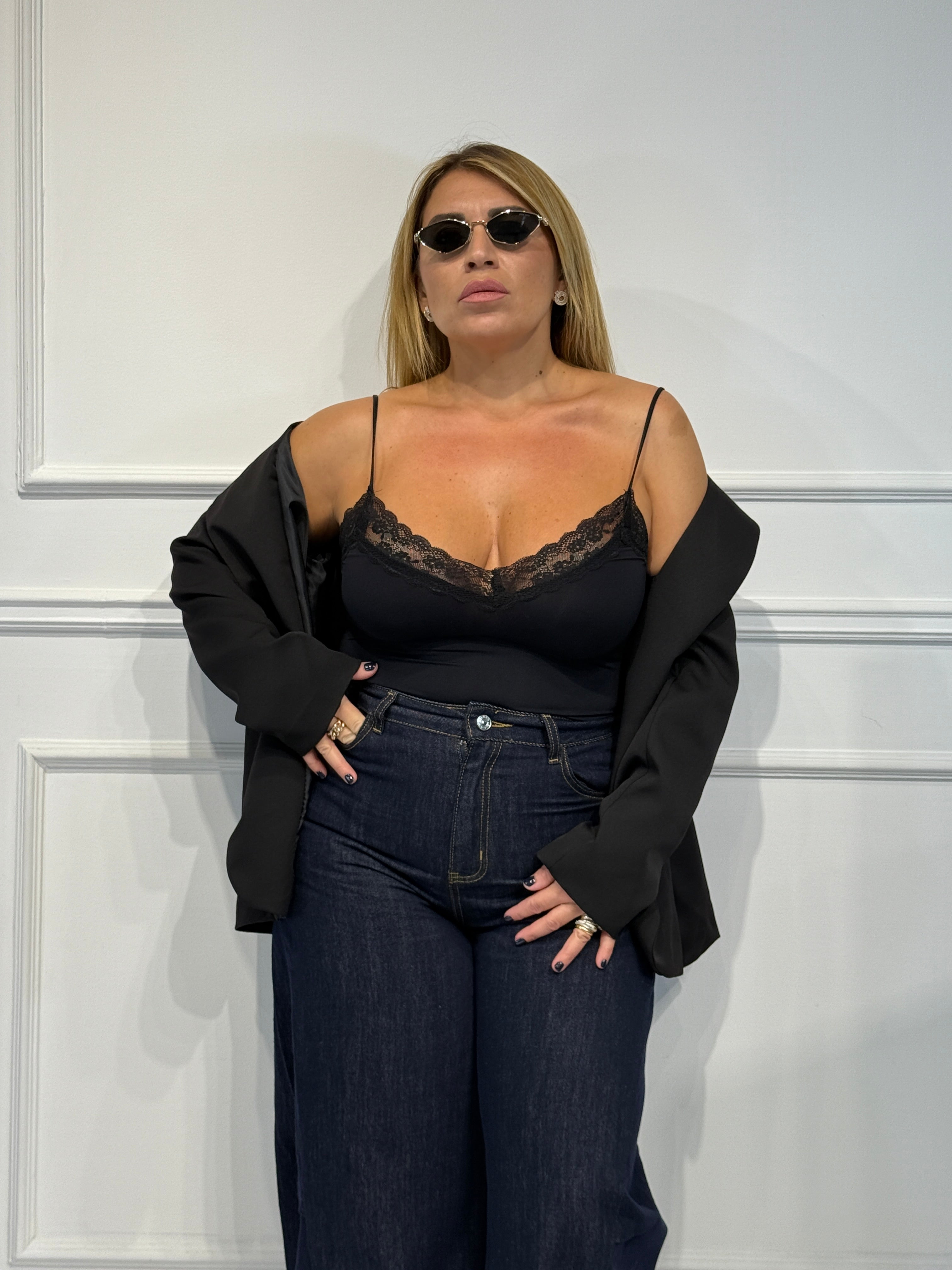 Body con bretella regolabile scollo a V con merletto elastico taglia unica veste fino ad una 46.