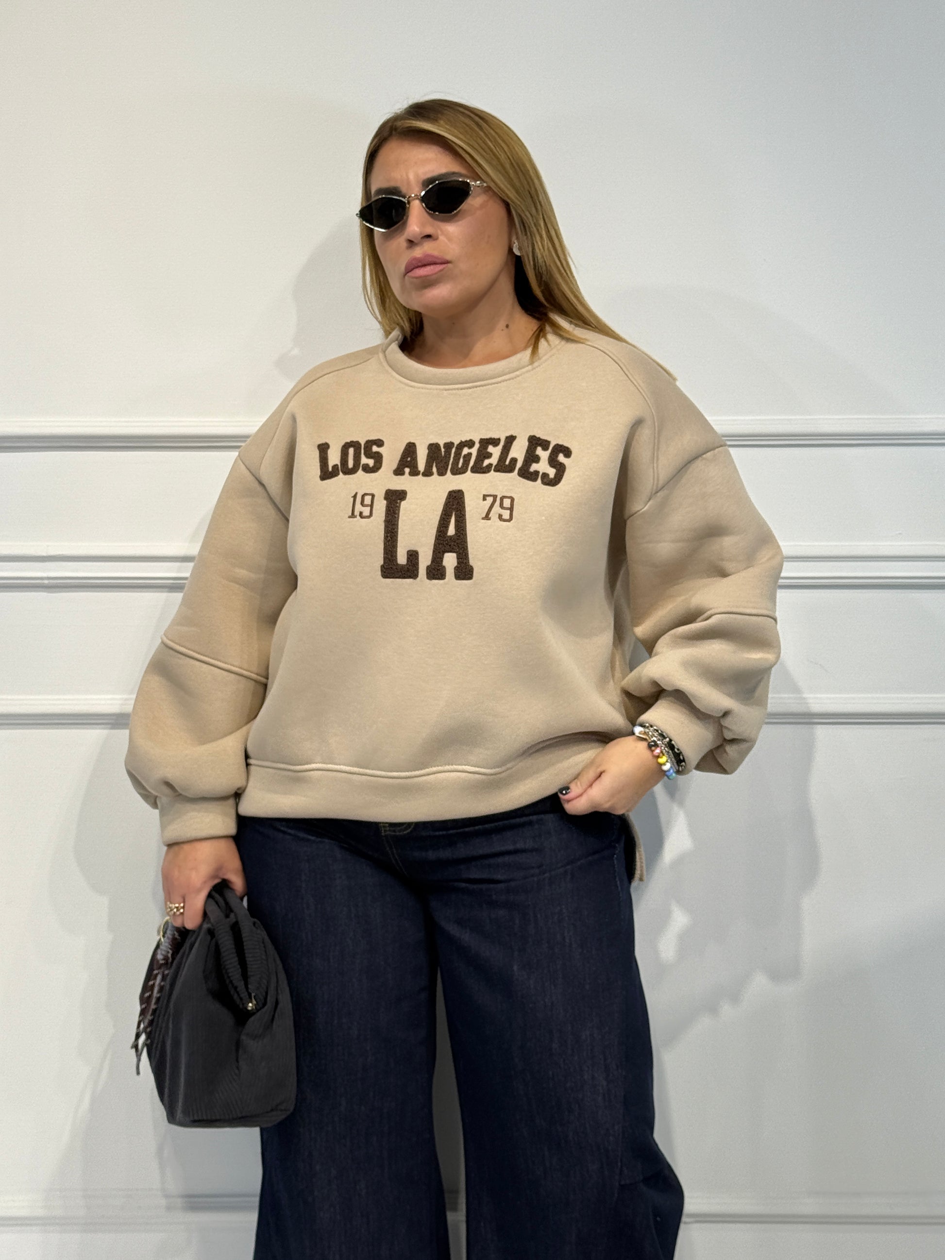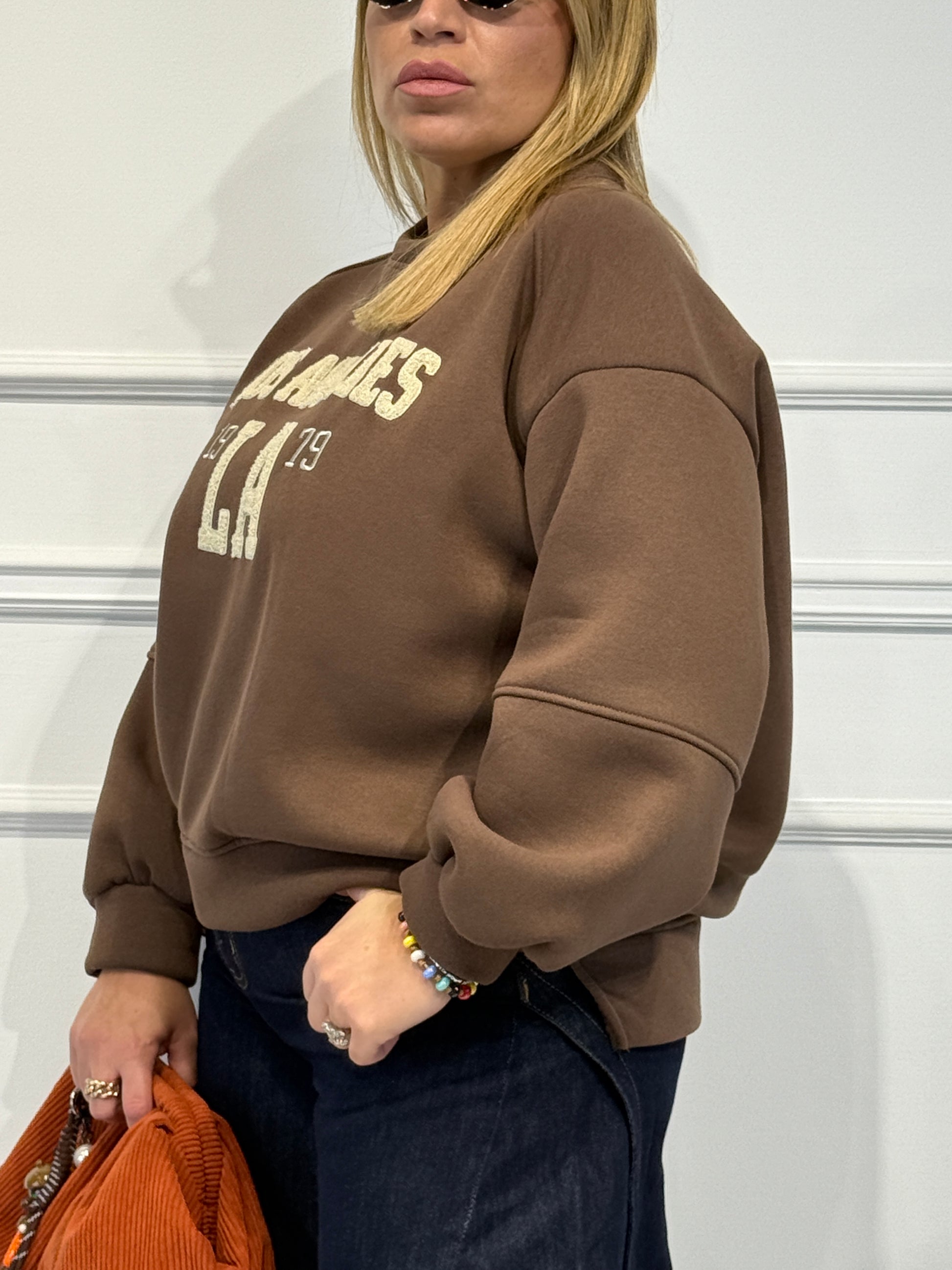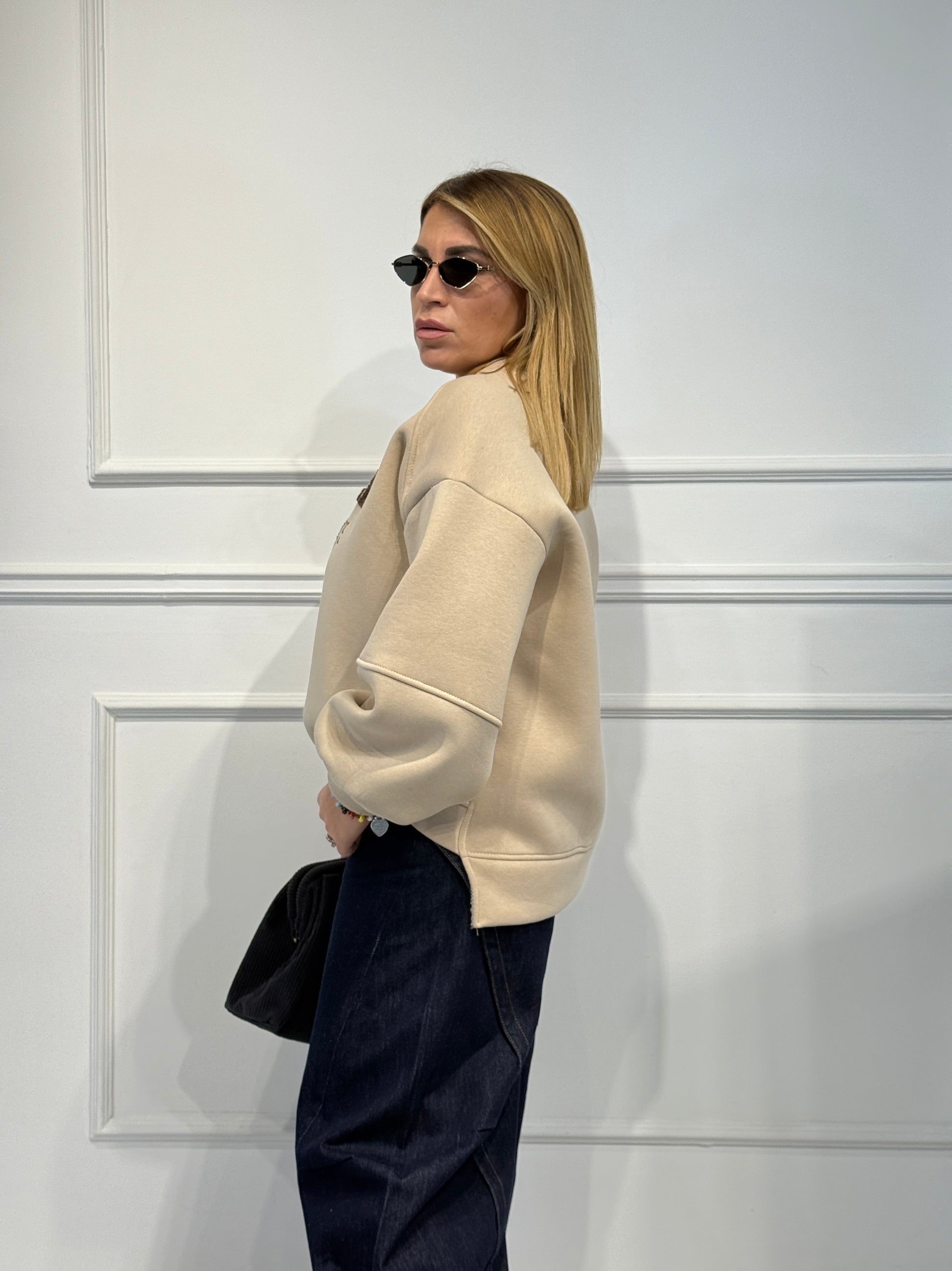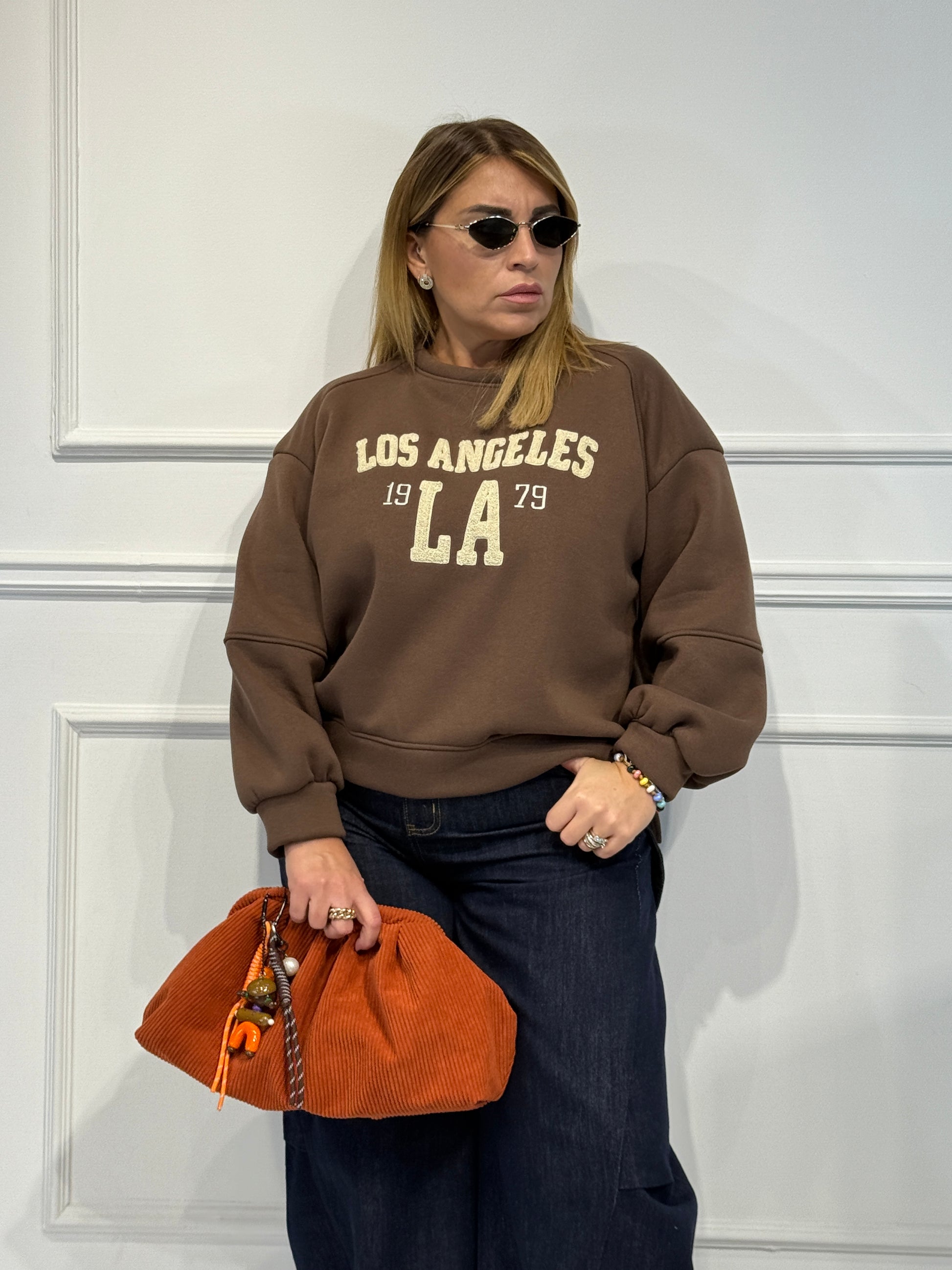 Felpa girocollo con stampa floccata tessuto garzato taglia unica veste fino ad una 48.