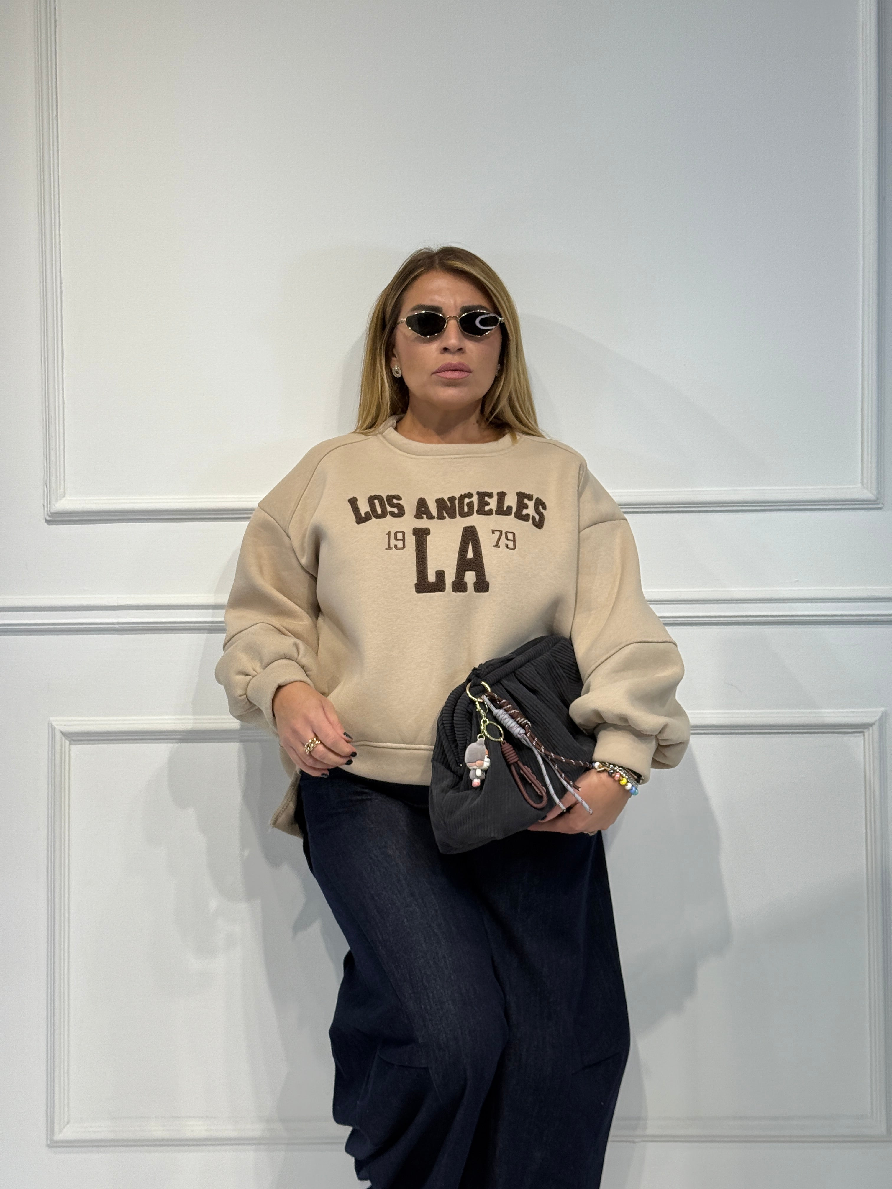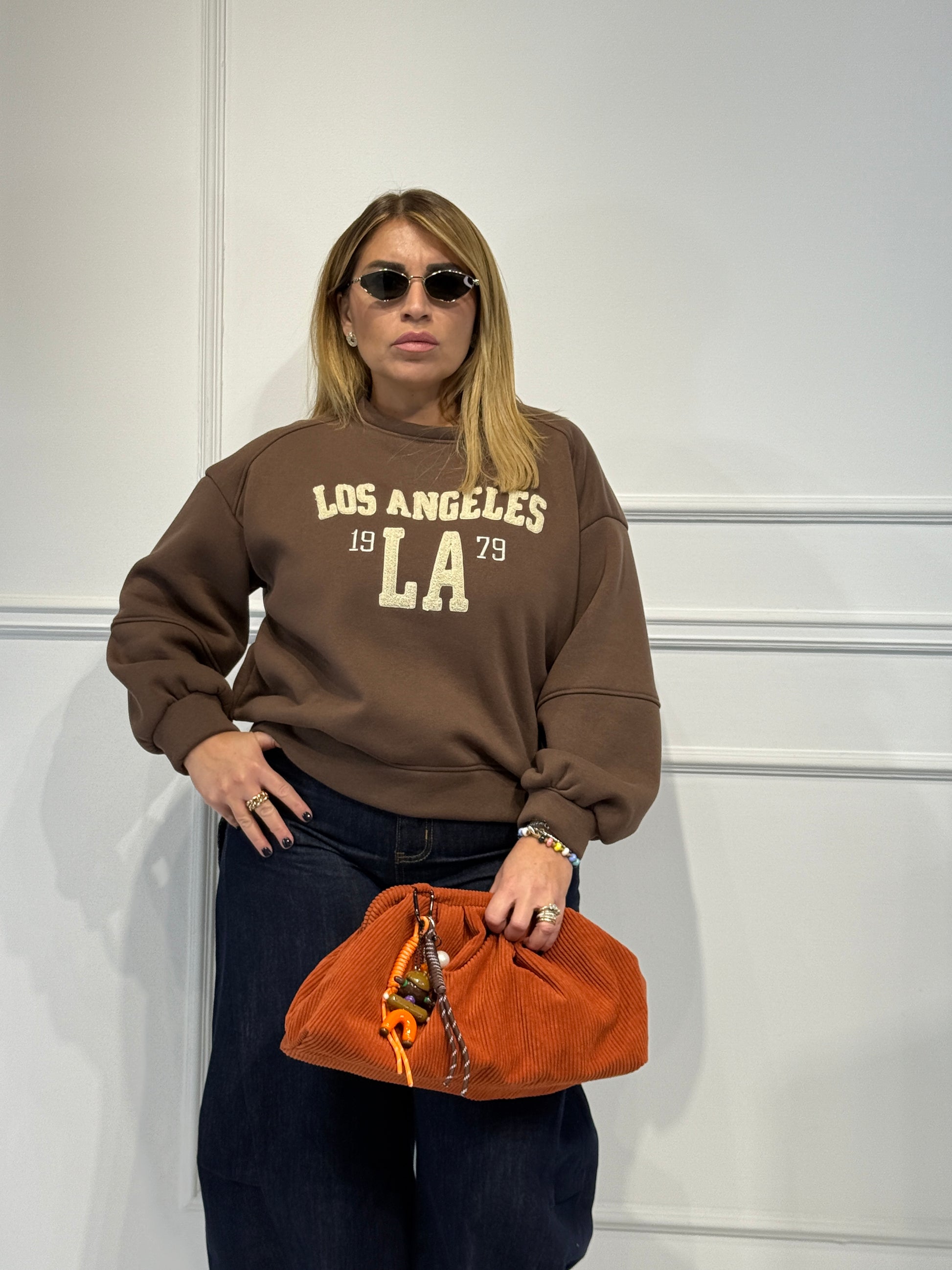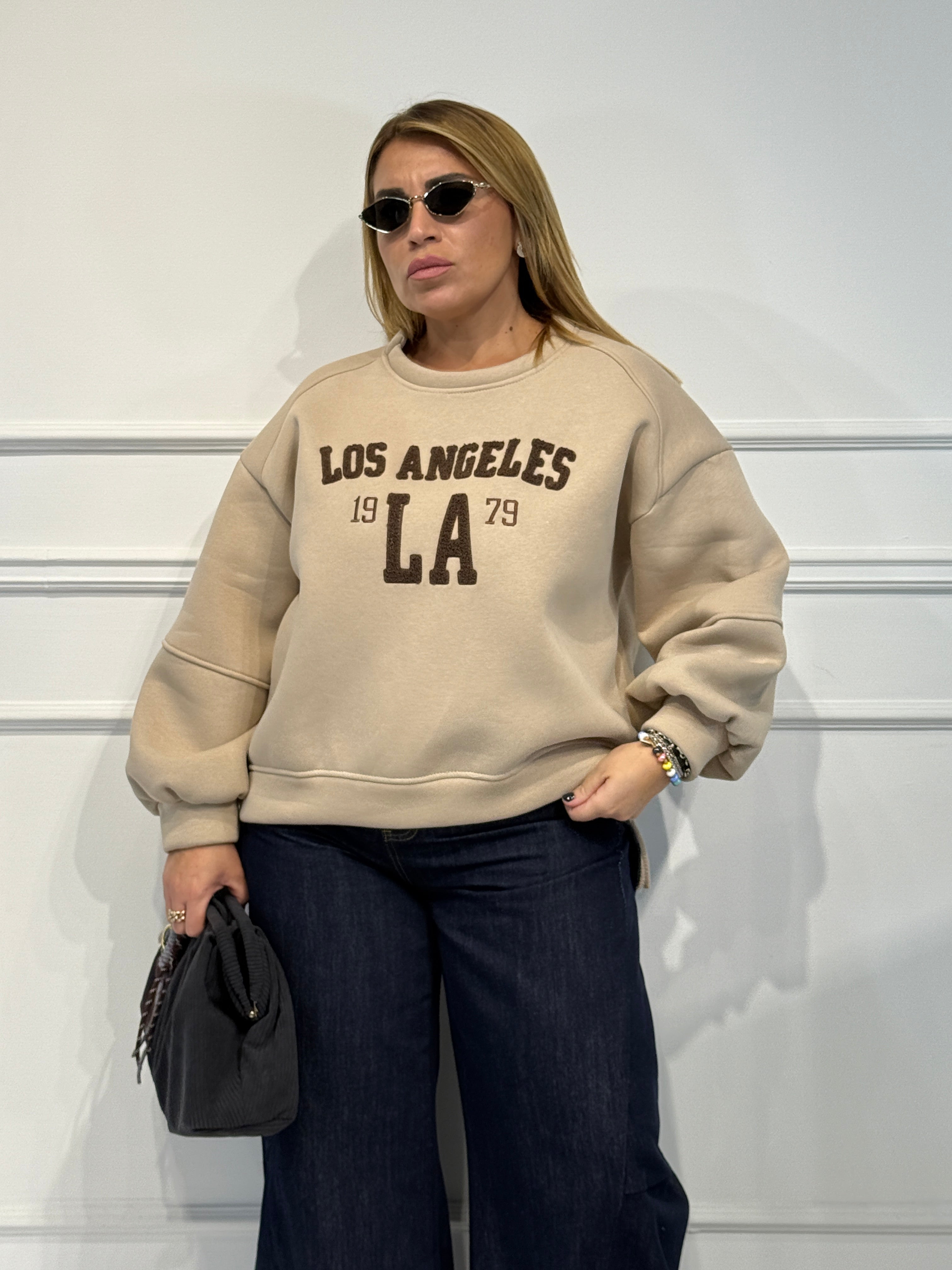 Felpa girocollo con stampa floccata tessuto garzato taglia unica veste fino ad una 48.