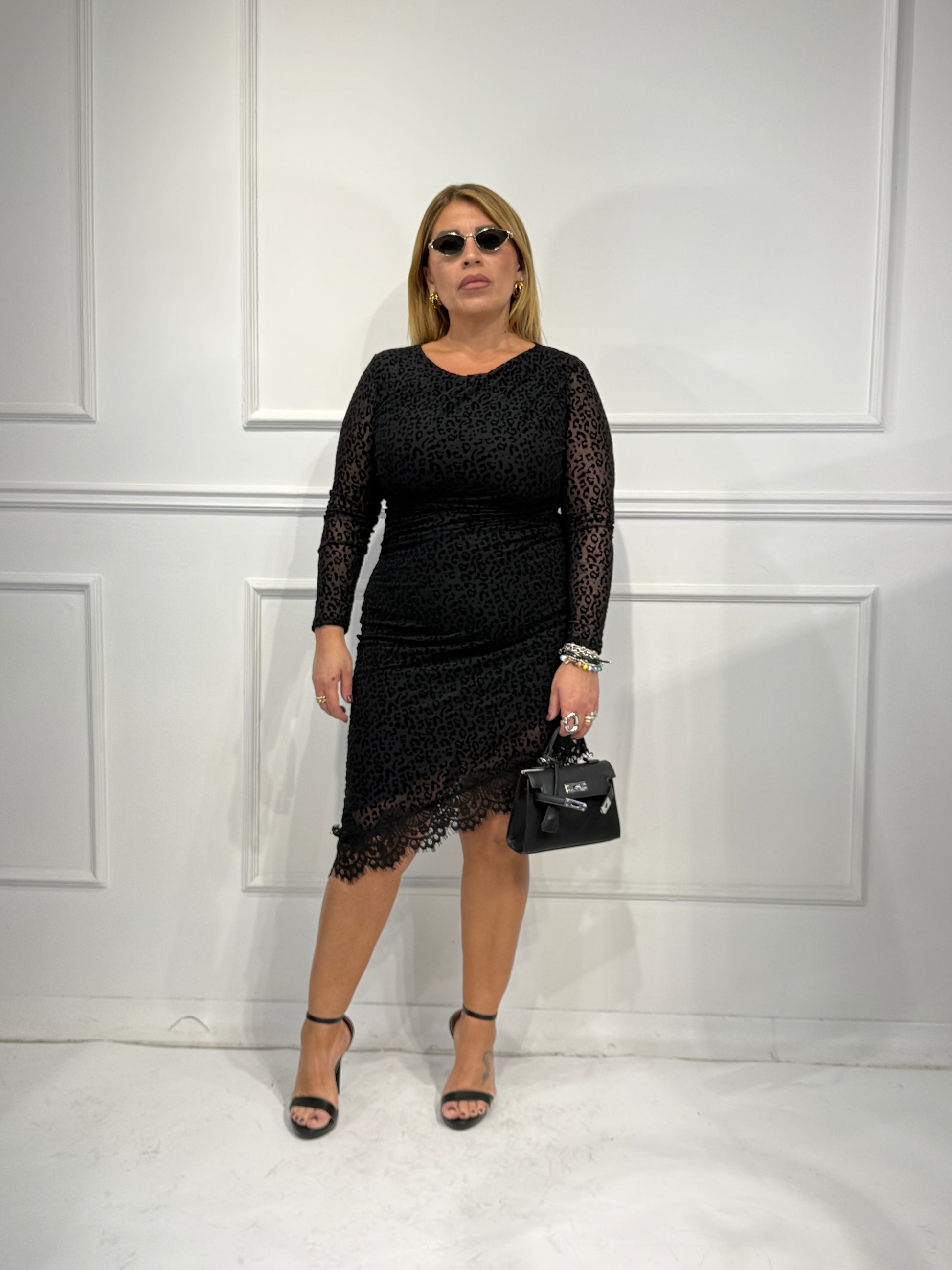 Abito con taglio trasversale fantasia animalier colore su colore,pizzo al fondo ,elastico