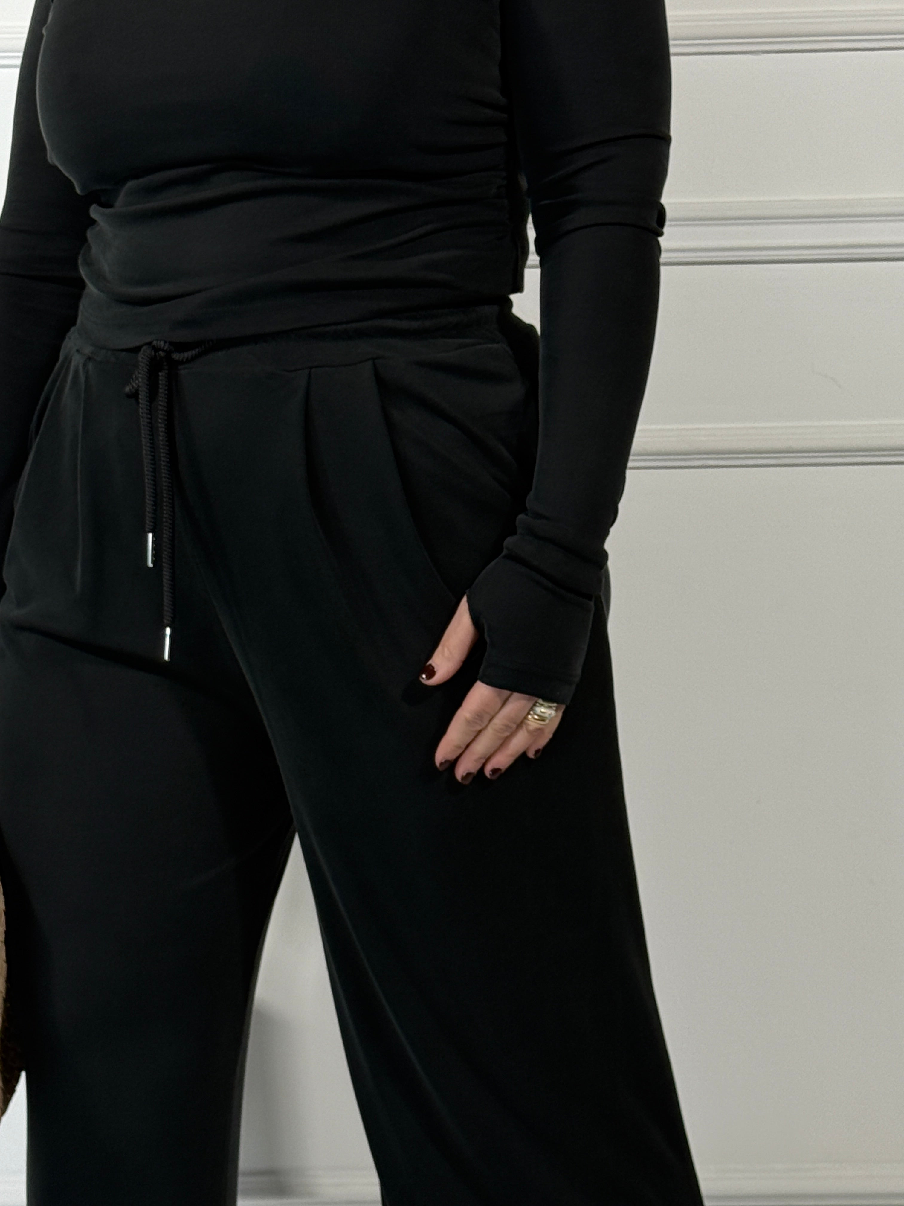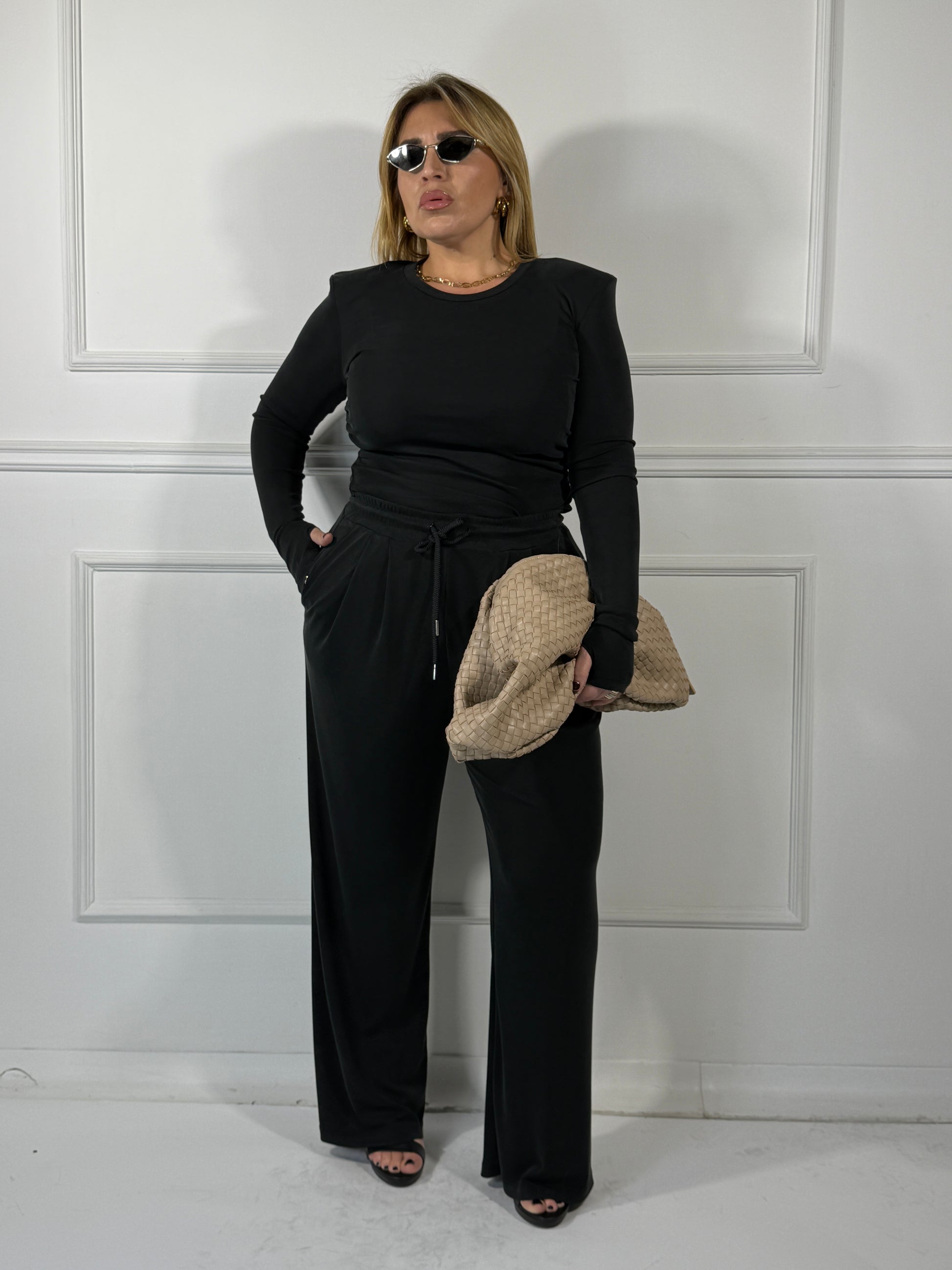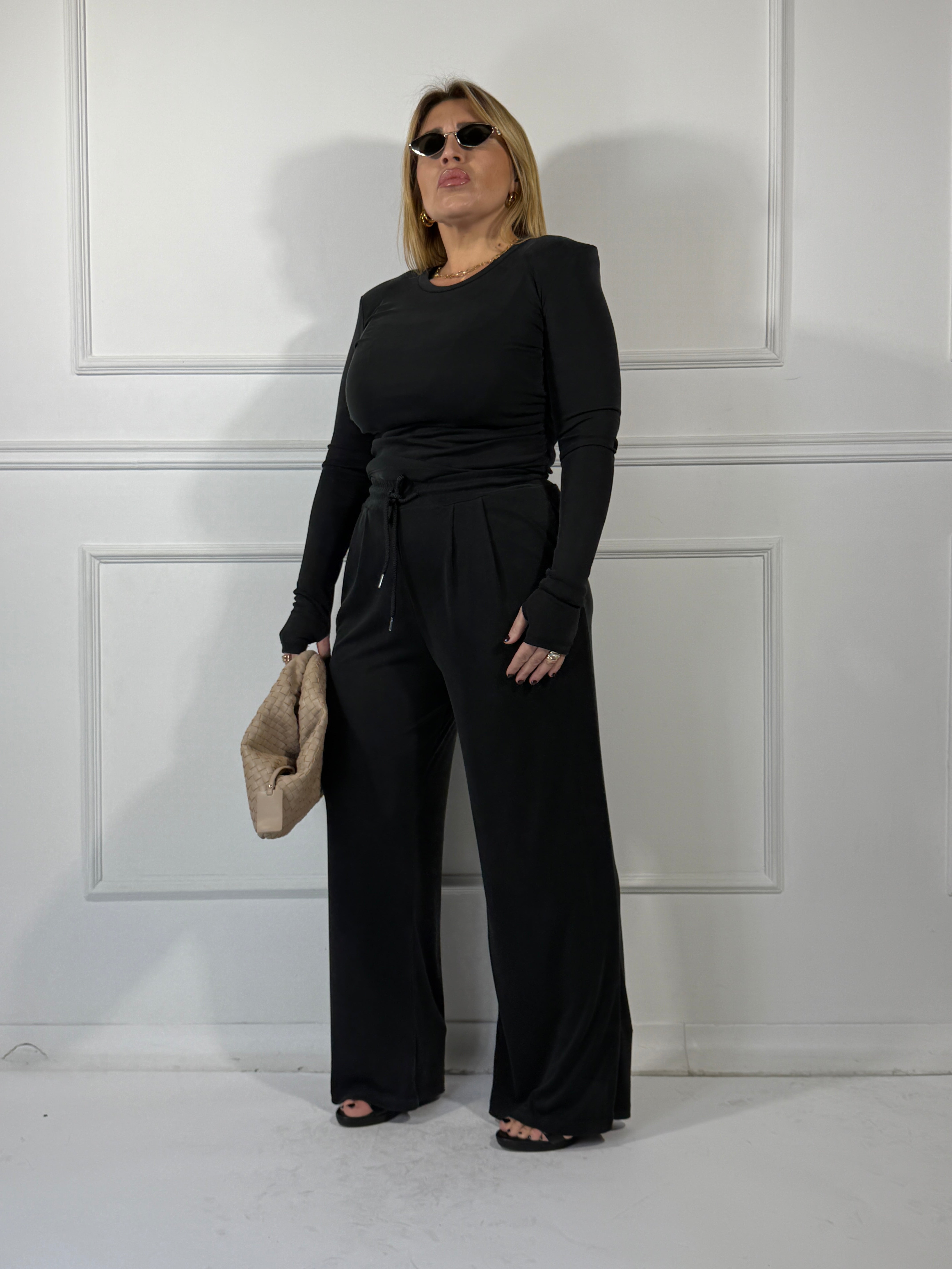 coordinato super morbido maglia cropped con spallina e manica a guanto pantalone con molla