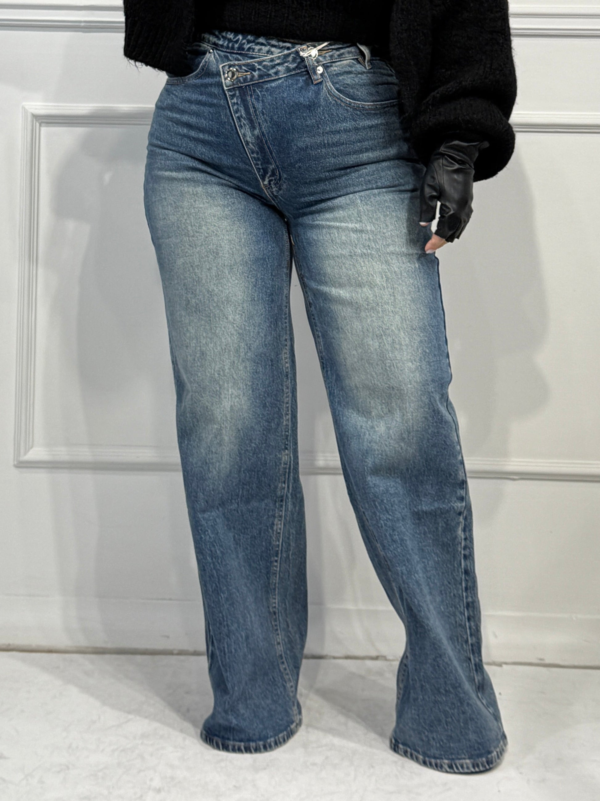 Jeans modello wide leg con chiusura trasversale lavaggio medio elastico taglie S M L