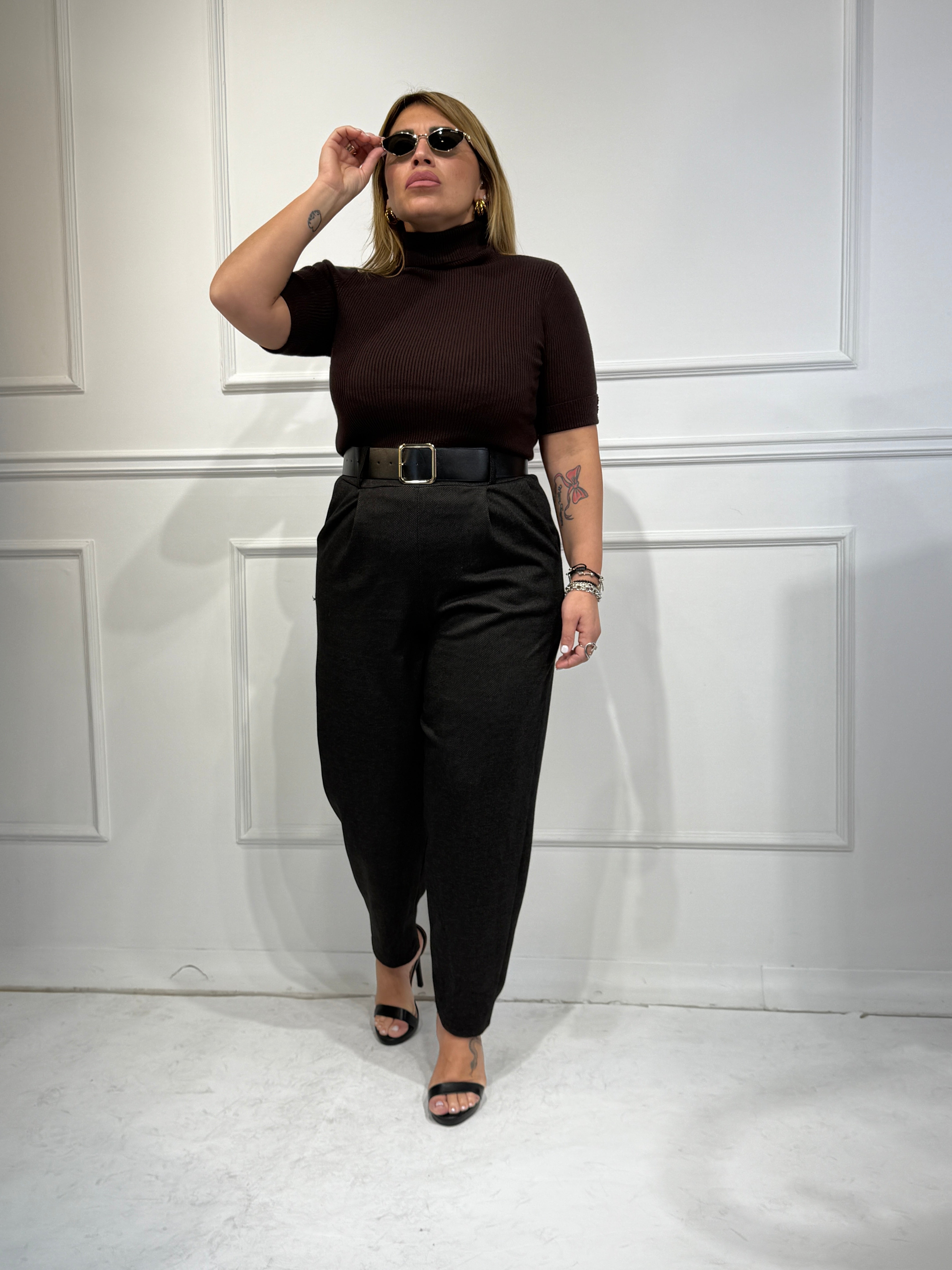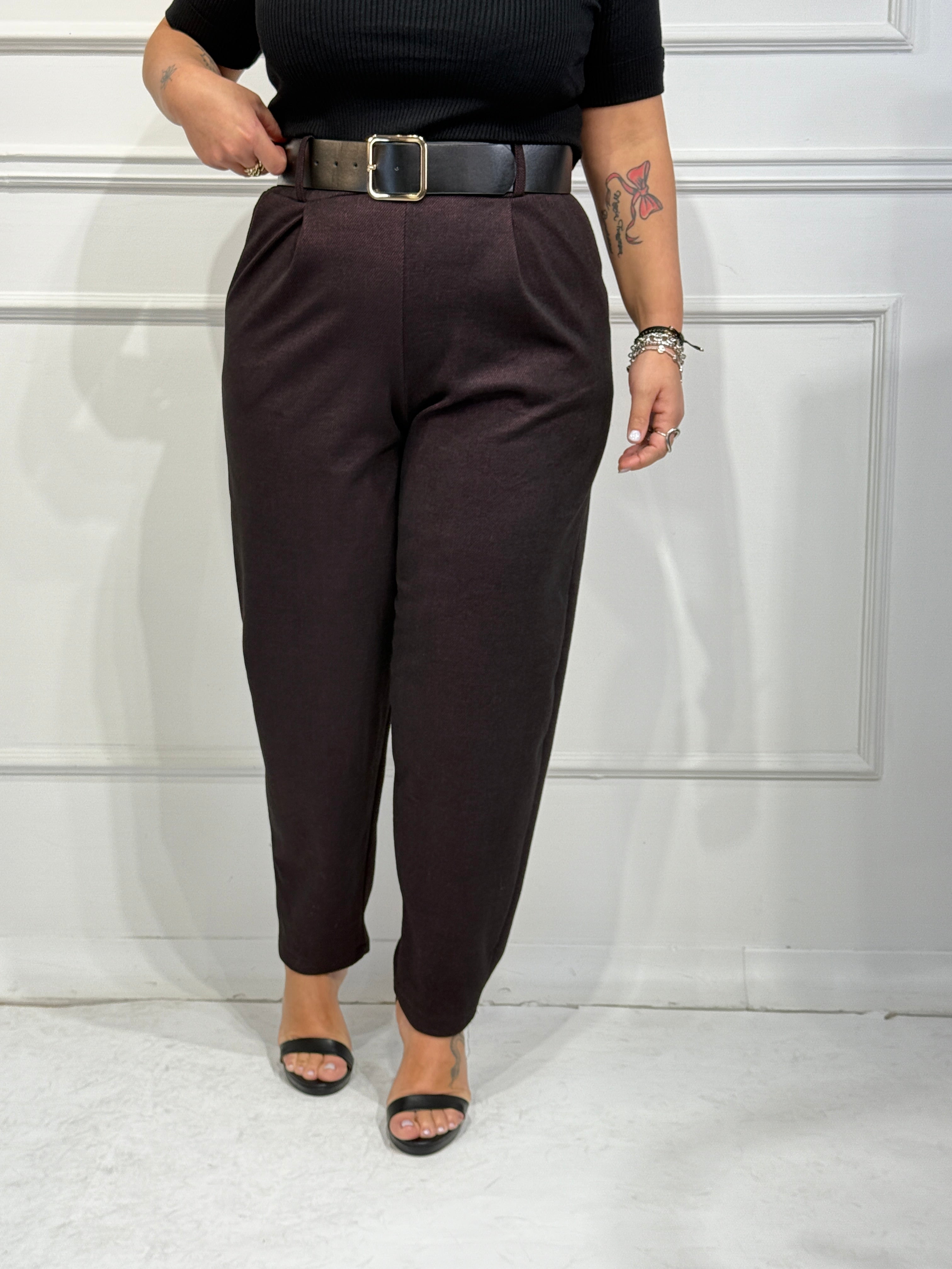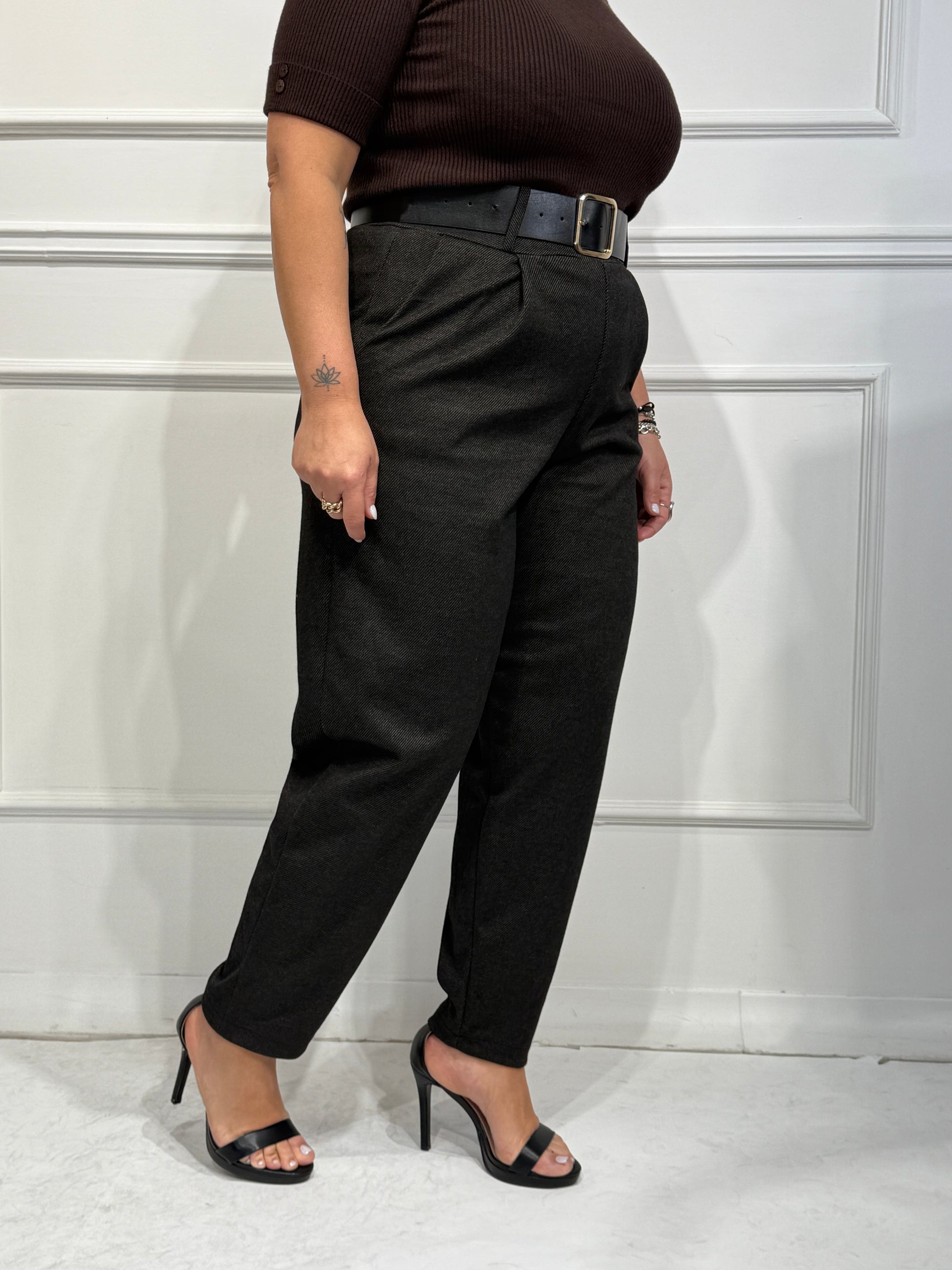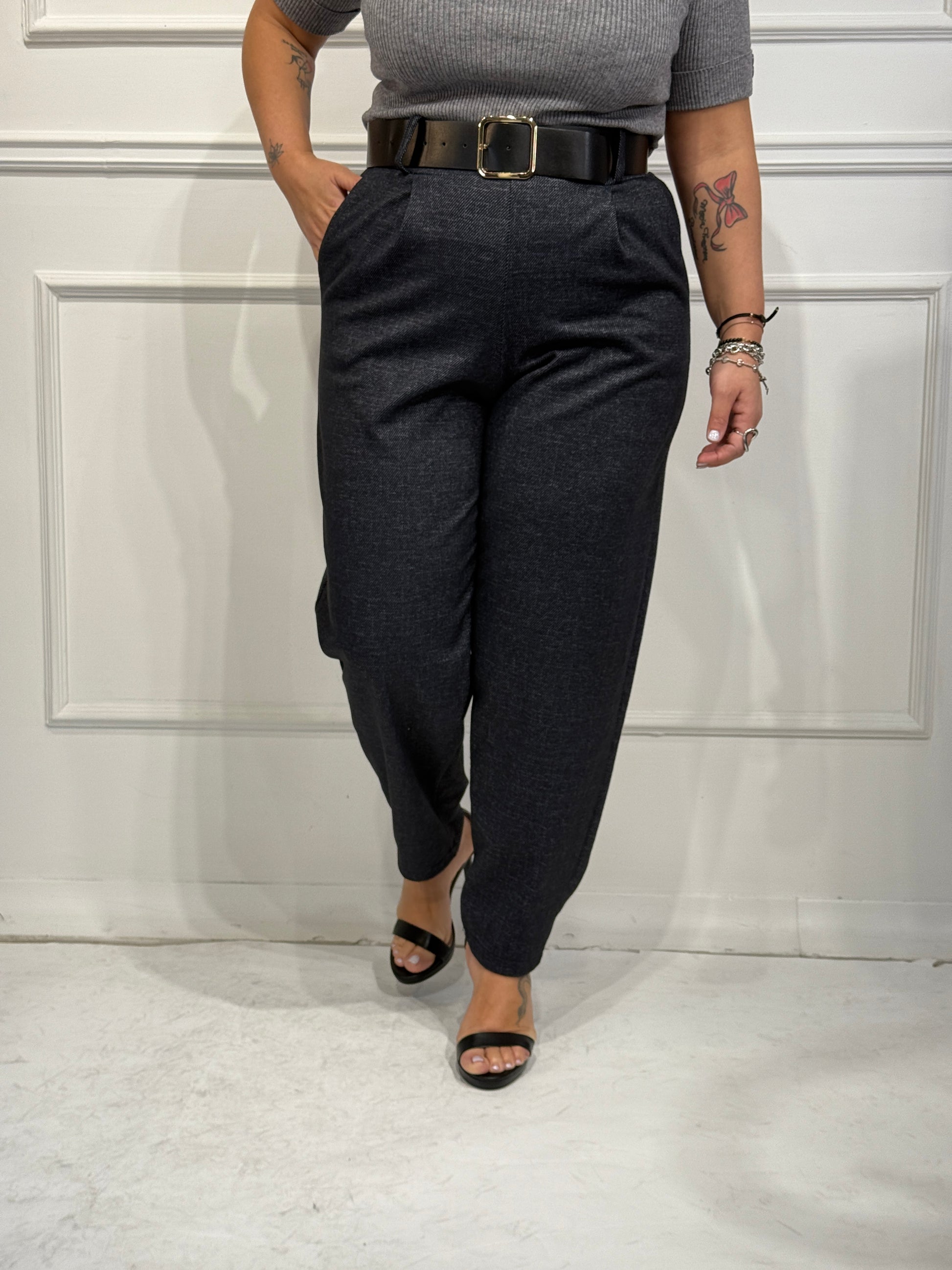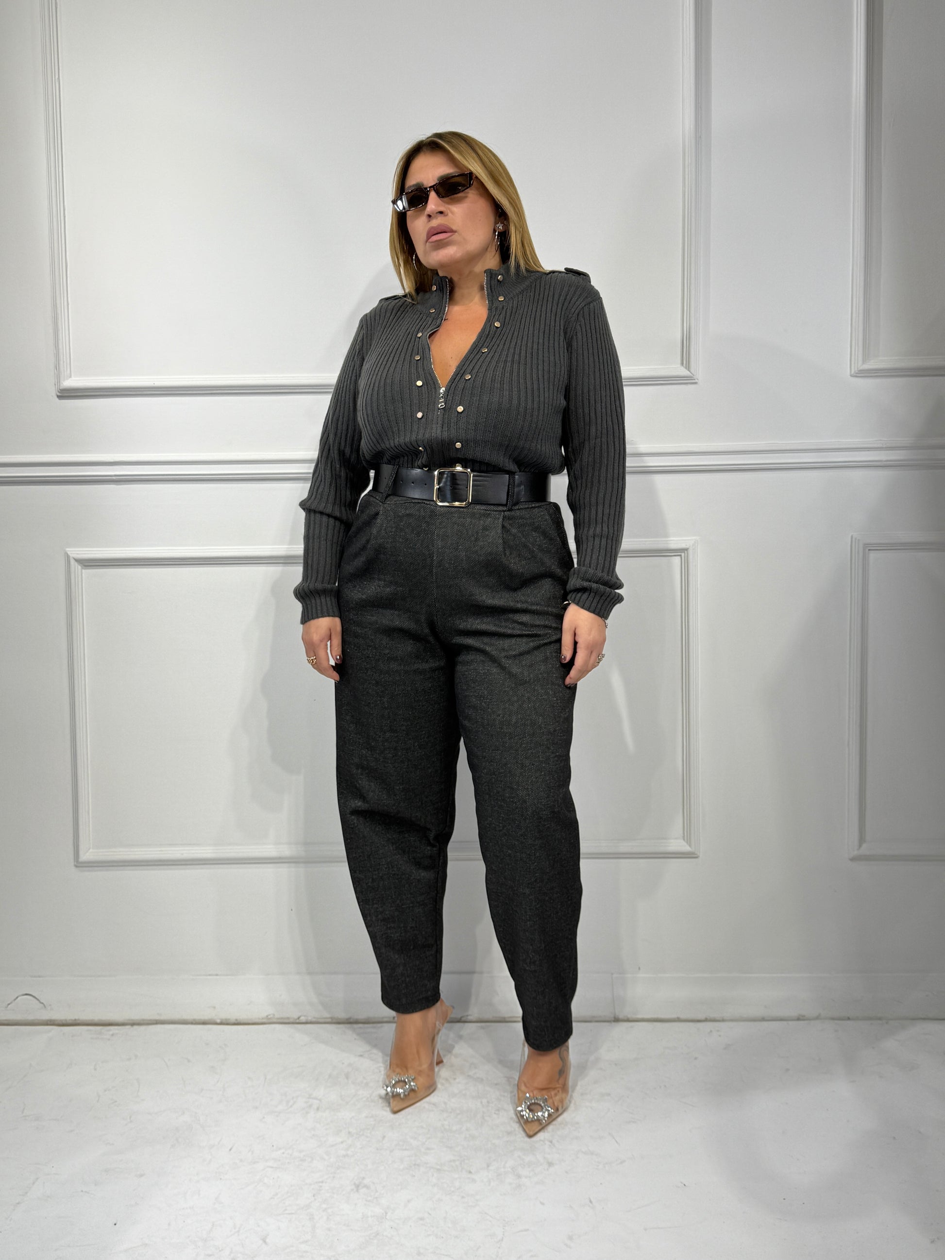 Pantalone con bustino semi elastico con piccole piace a sul davanti  tessuto caldo spigato con Cintura ,Taglia unica  veste fino ad una 48 /50