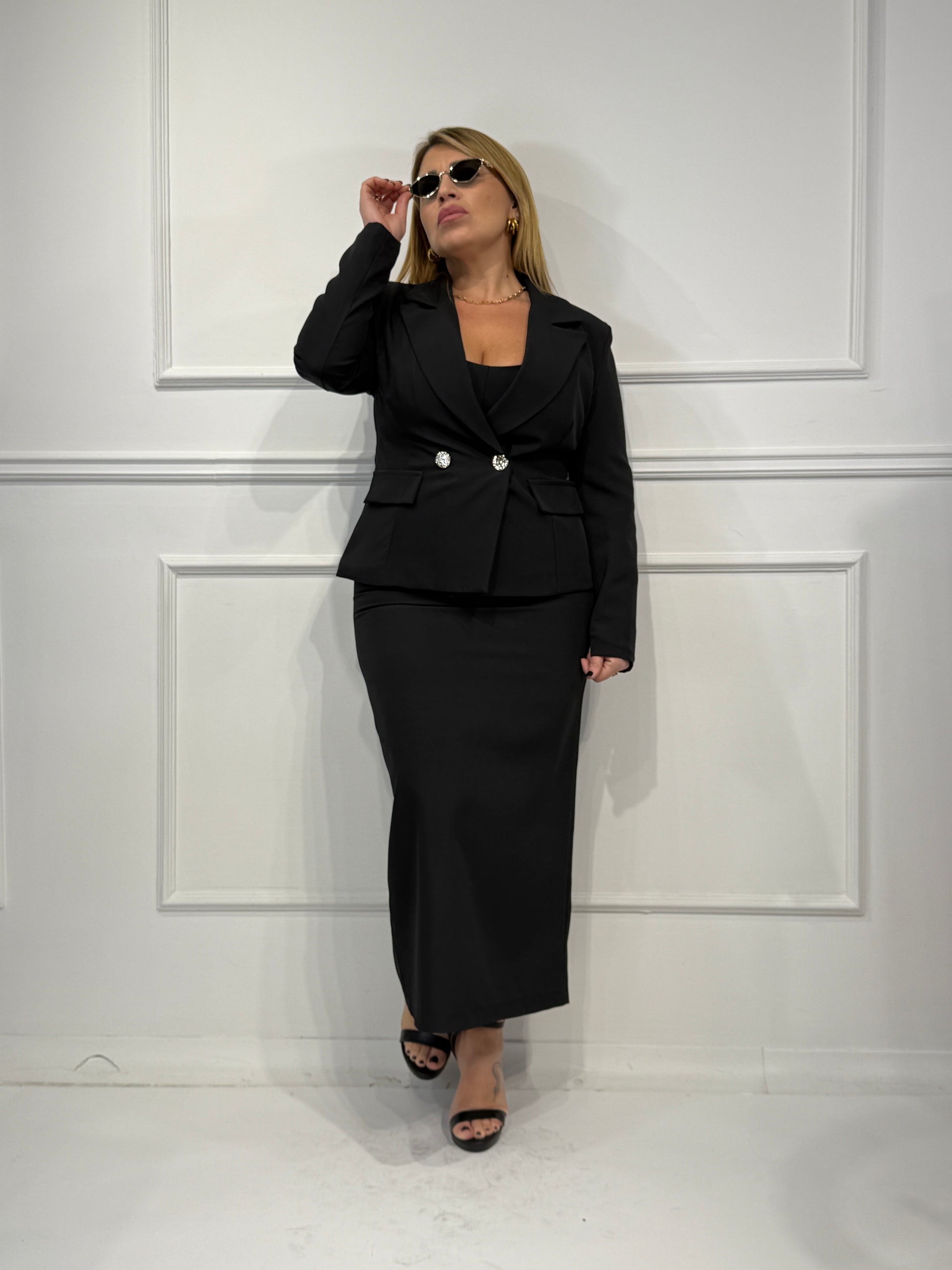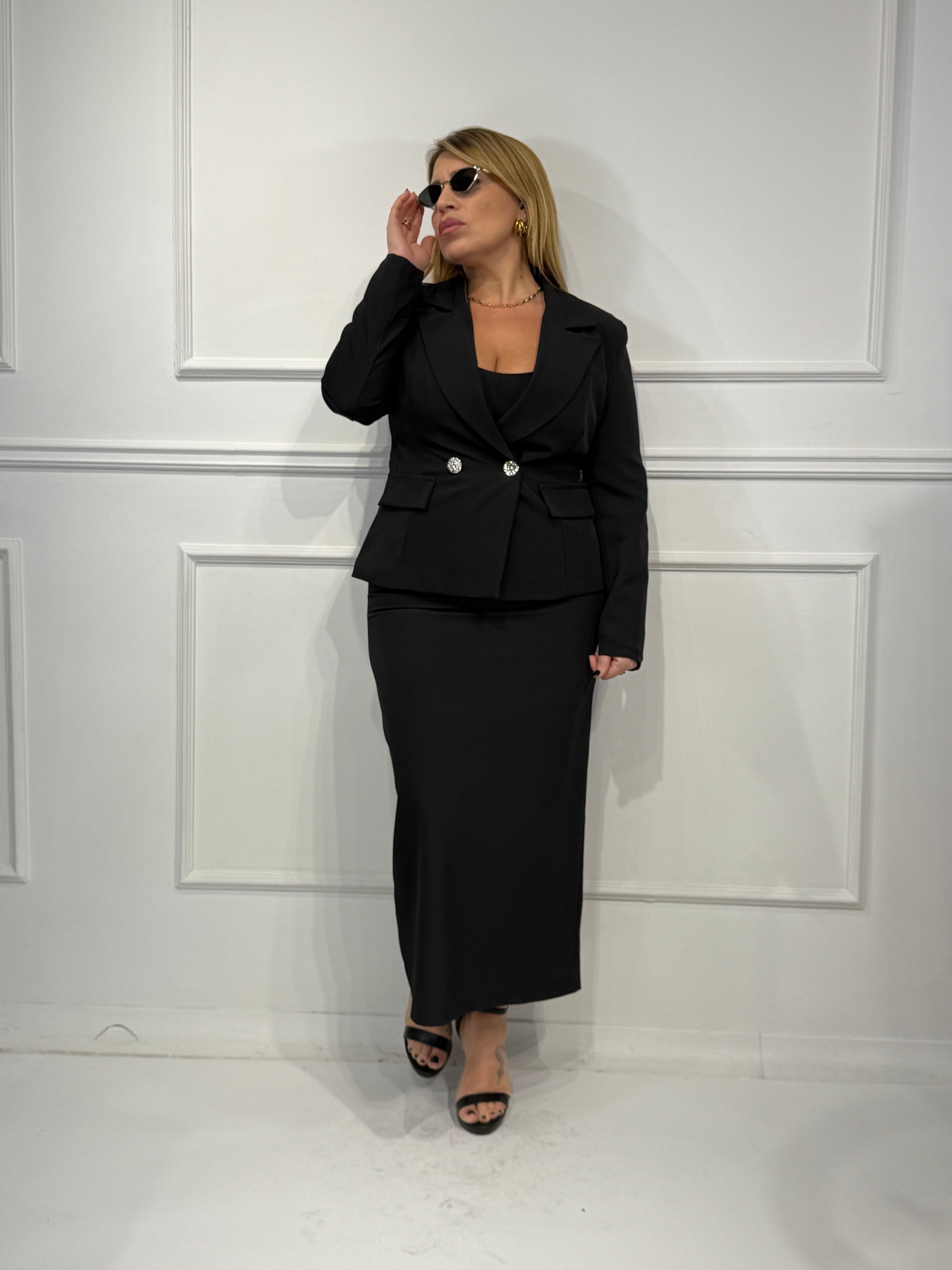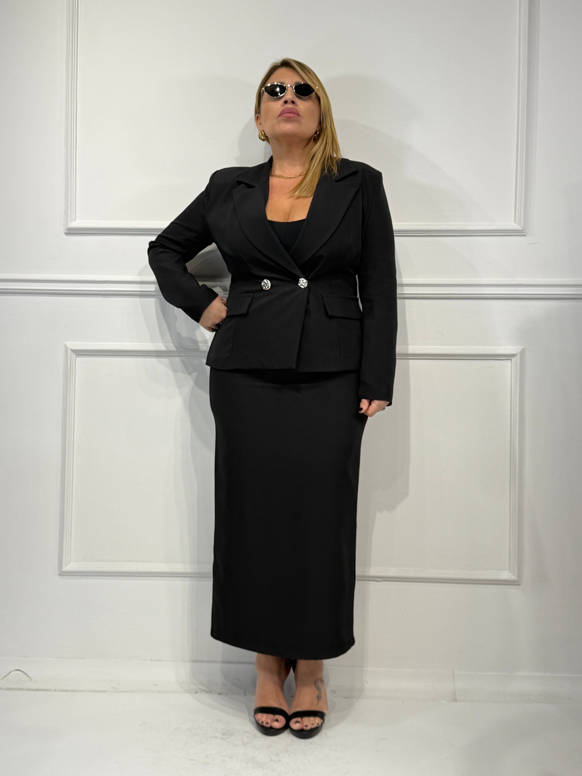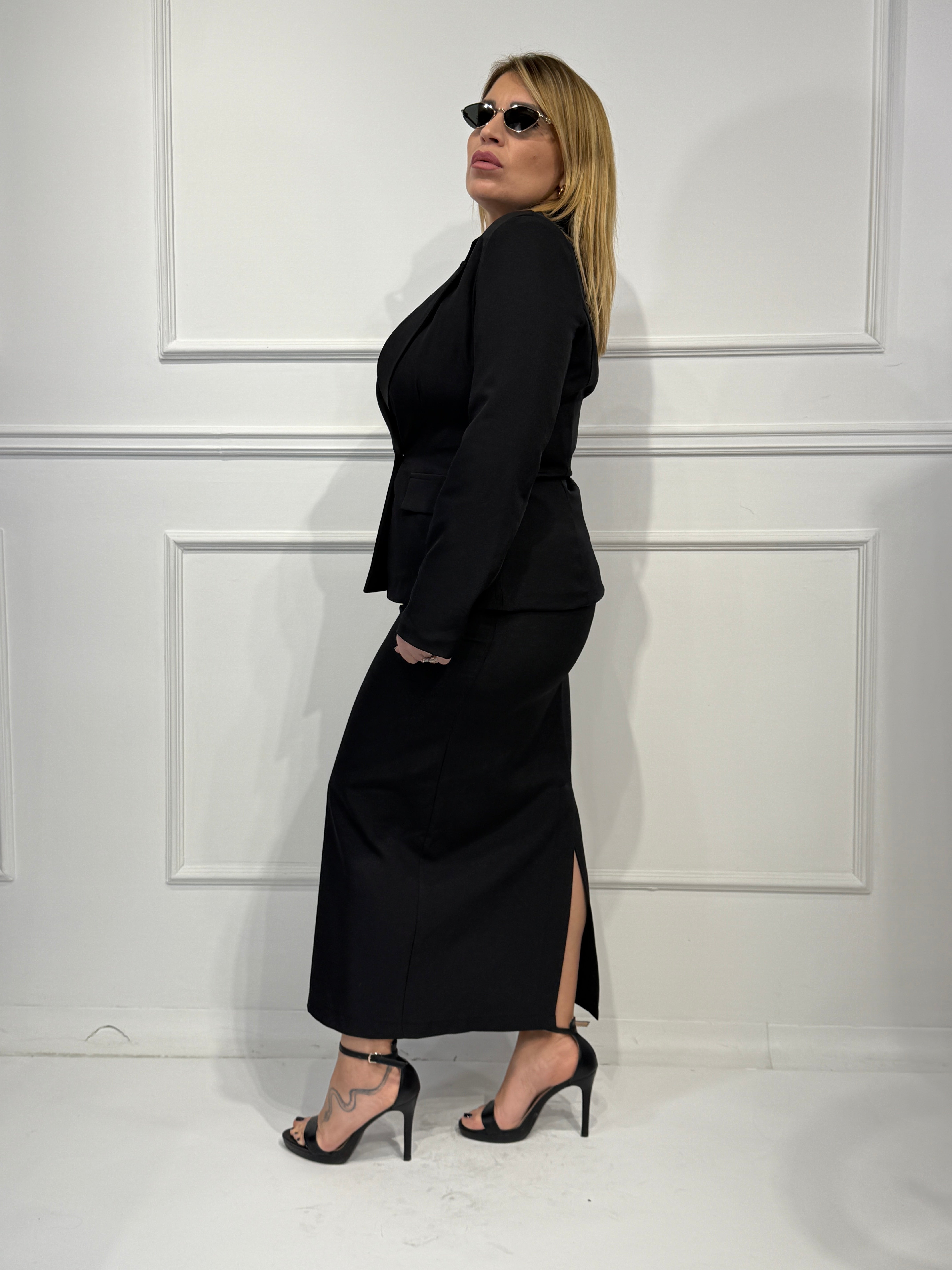 Tailleur con giacca corta con bottoni in oro,gonna longuette con spacco sul retro e chiusura con zip